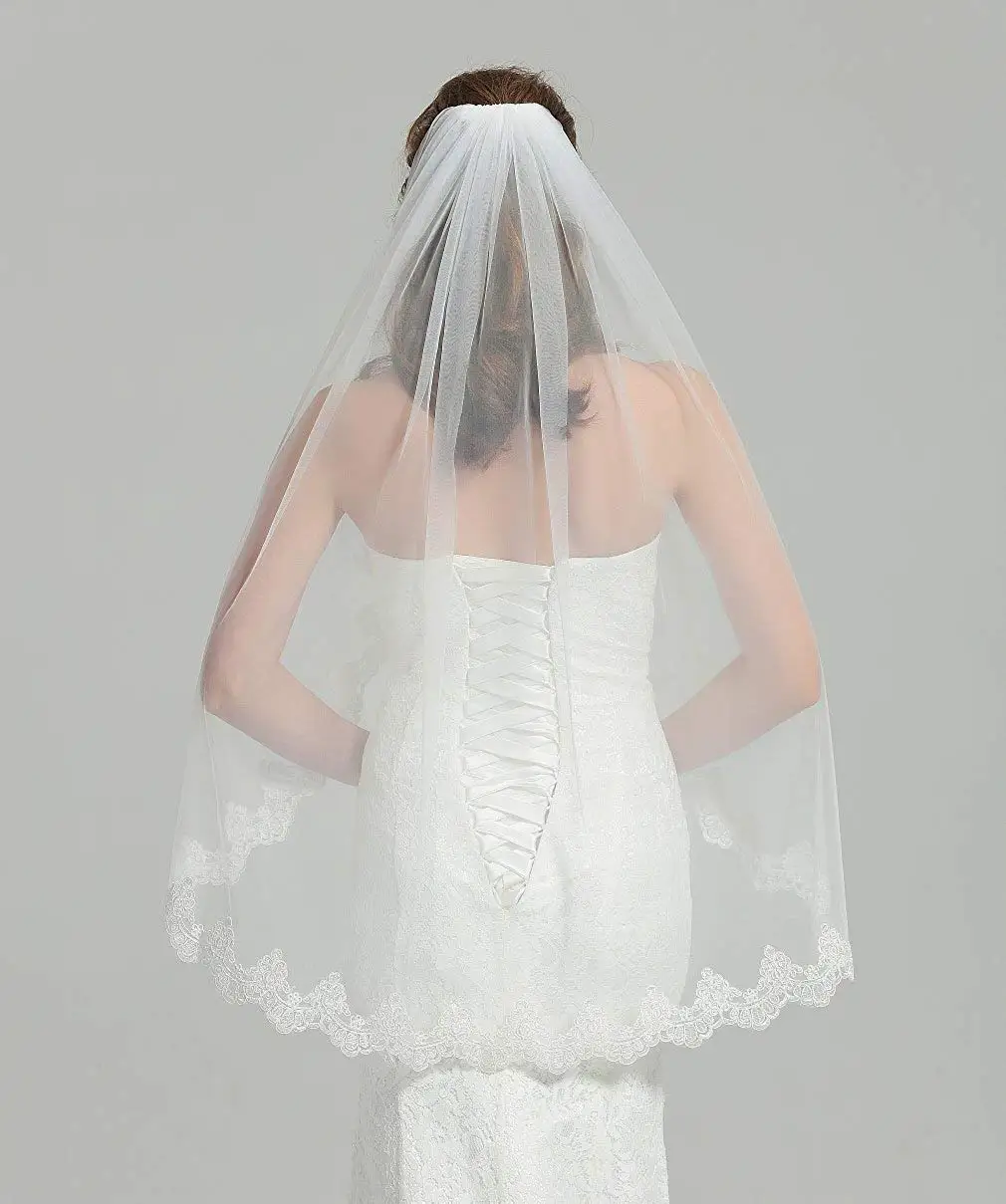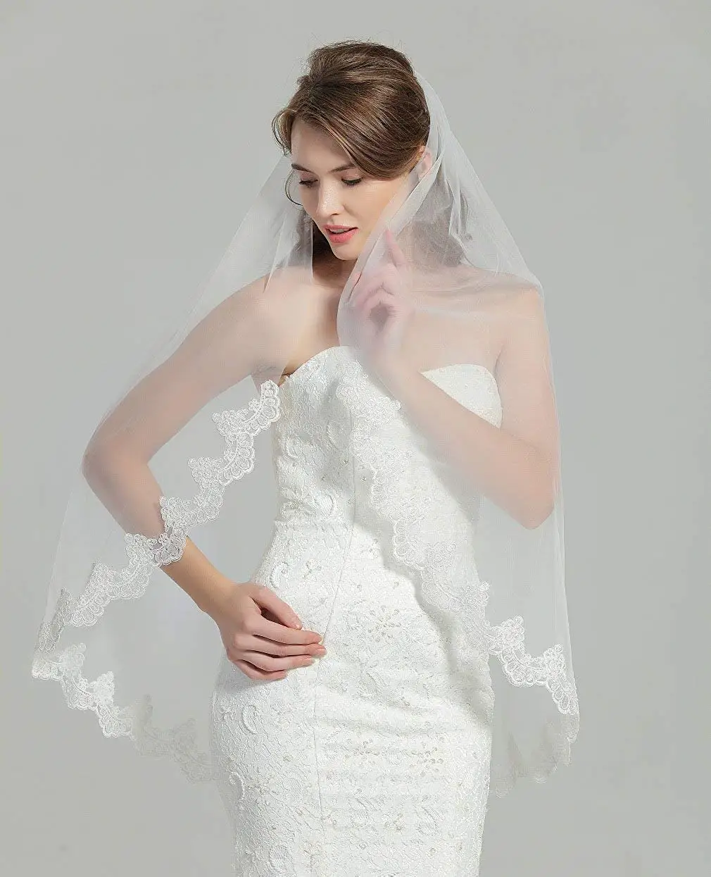 Белая Фата с гребнем, 1 яруса, Кружевная аппликация по краям, длина кончика пальца, 41 дюйм, кружевная вуаль