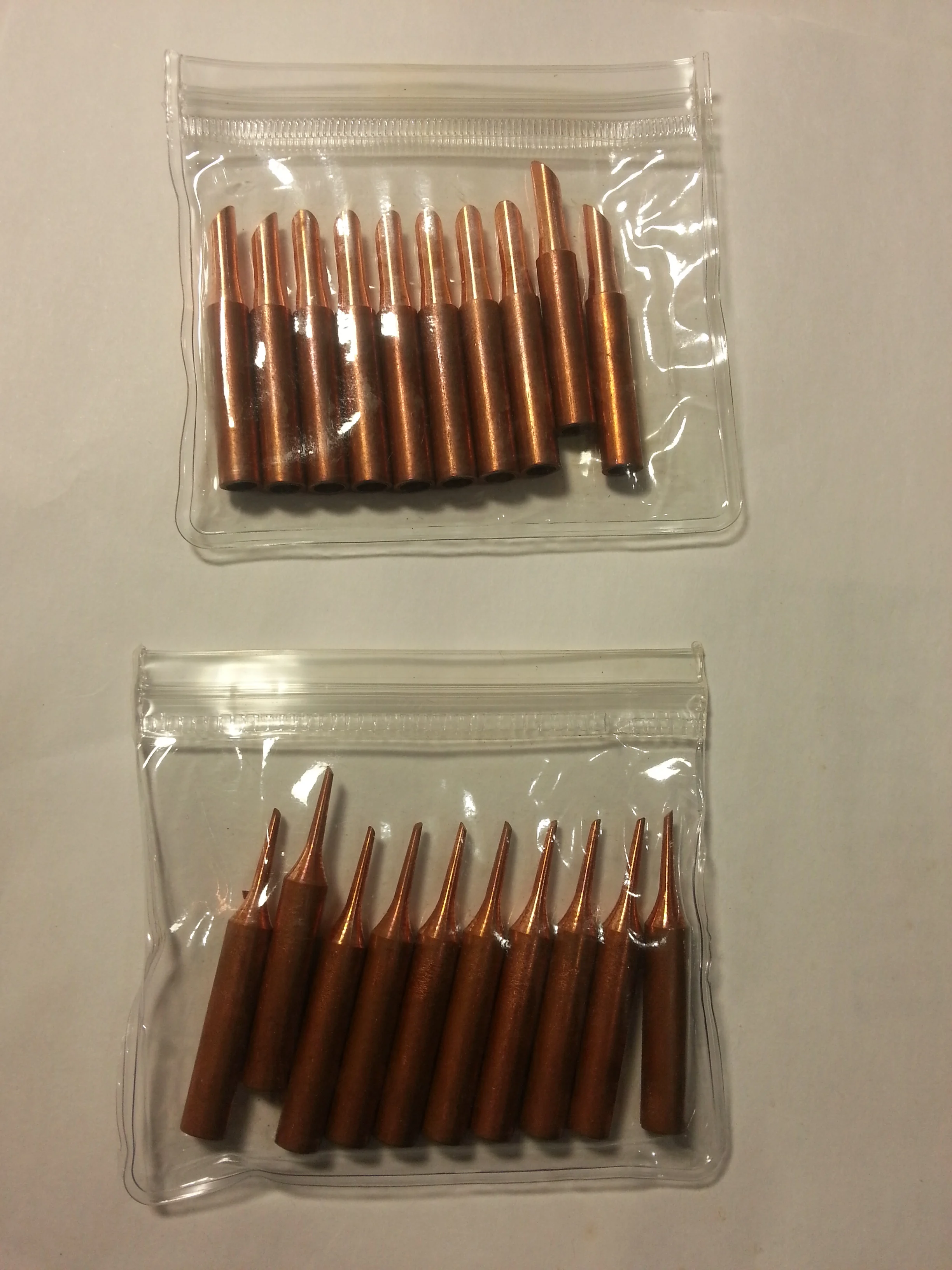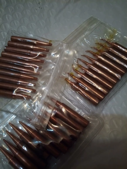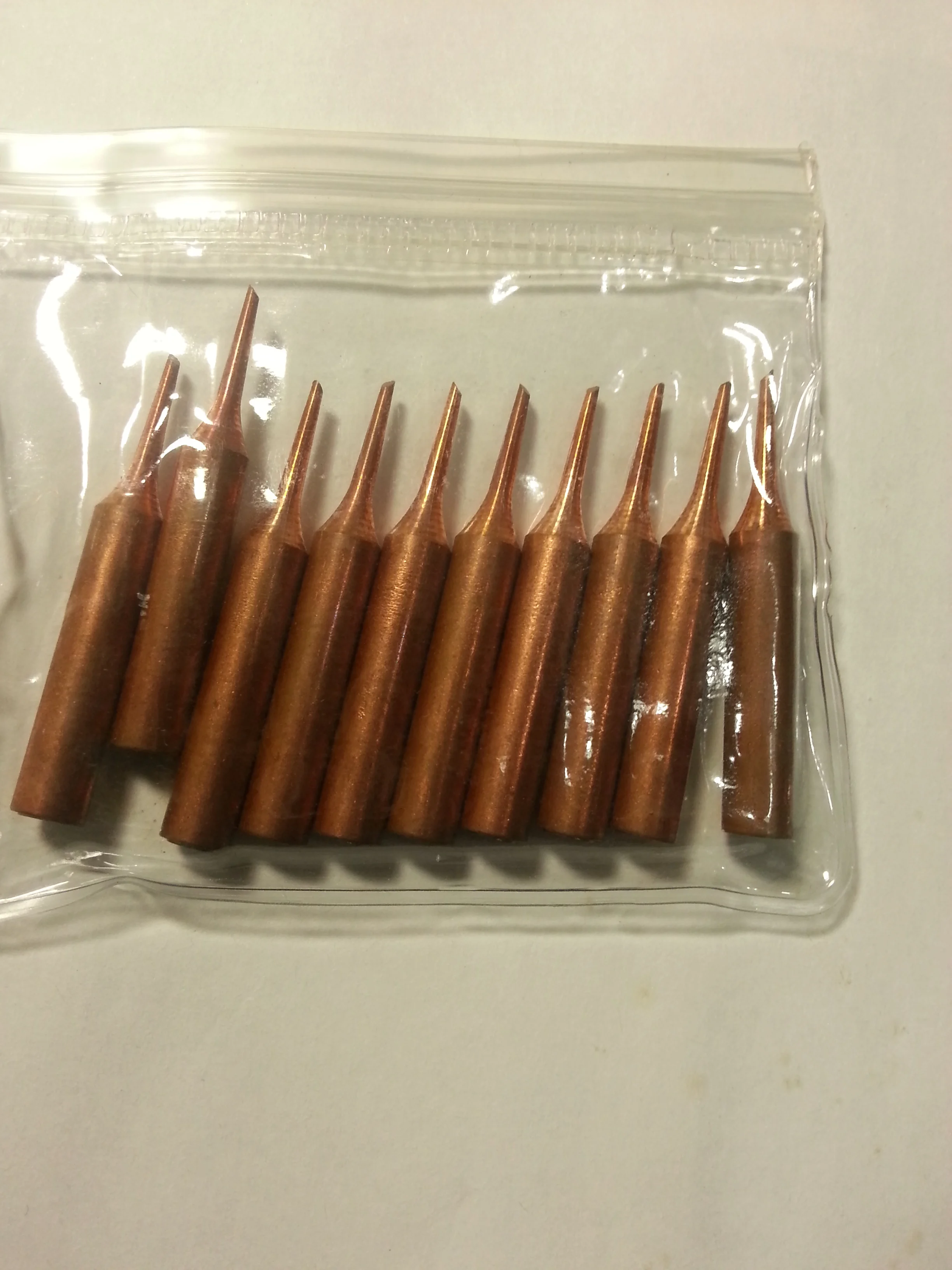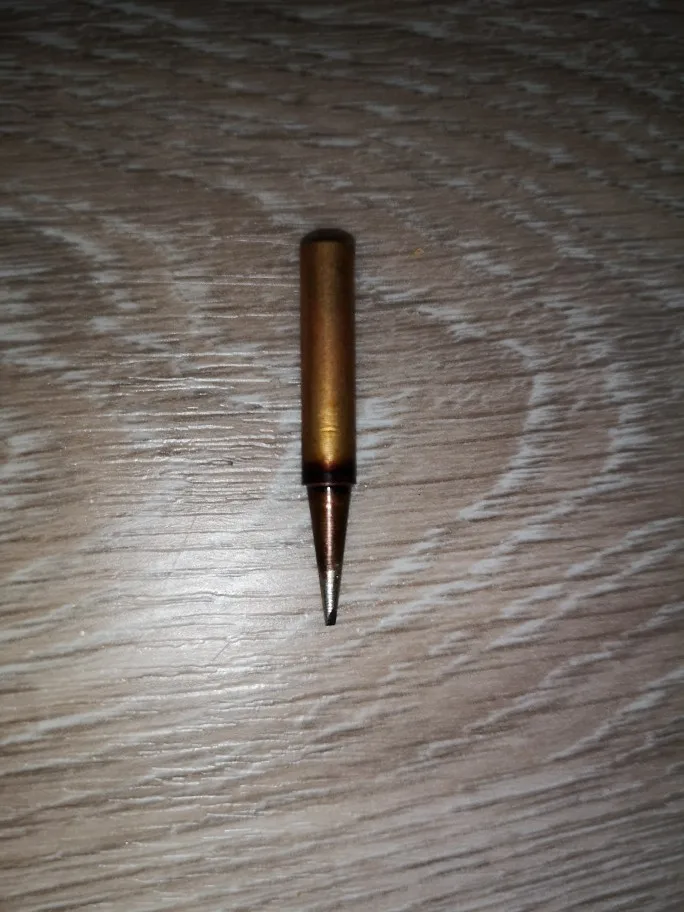 Советское олово липнет отлично. Внутри наконечников уплотнительная металлическая трубка, что большой плюс не надо будет переставлять из родного жала паяльника. Походит на медь, как обгорать будет не знаю, паять особо нече. Для мощных паяльников самые толстые будет идеально, а то в комплекте с паяльника и в основном тонкие, что то массивное не спаять, а с этими жалами есть надежда. По размерам идеально подходит, как родные. Приехало быстро с остальными товарами.