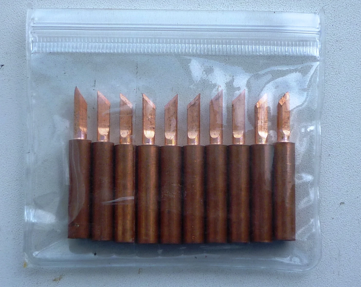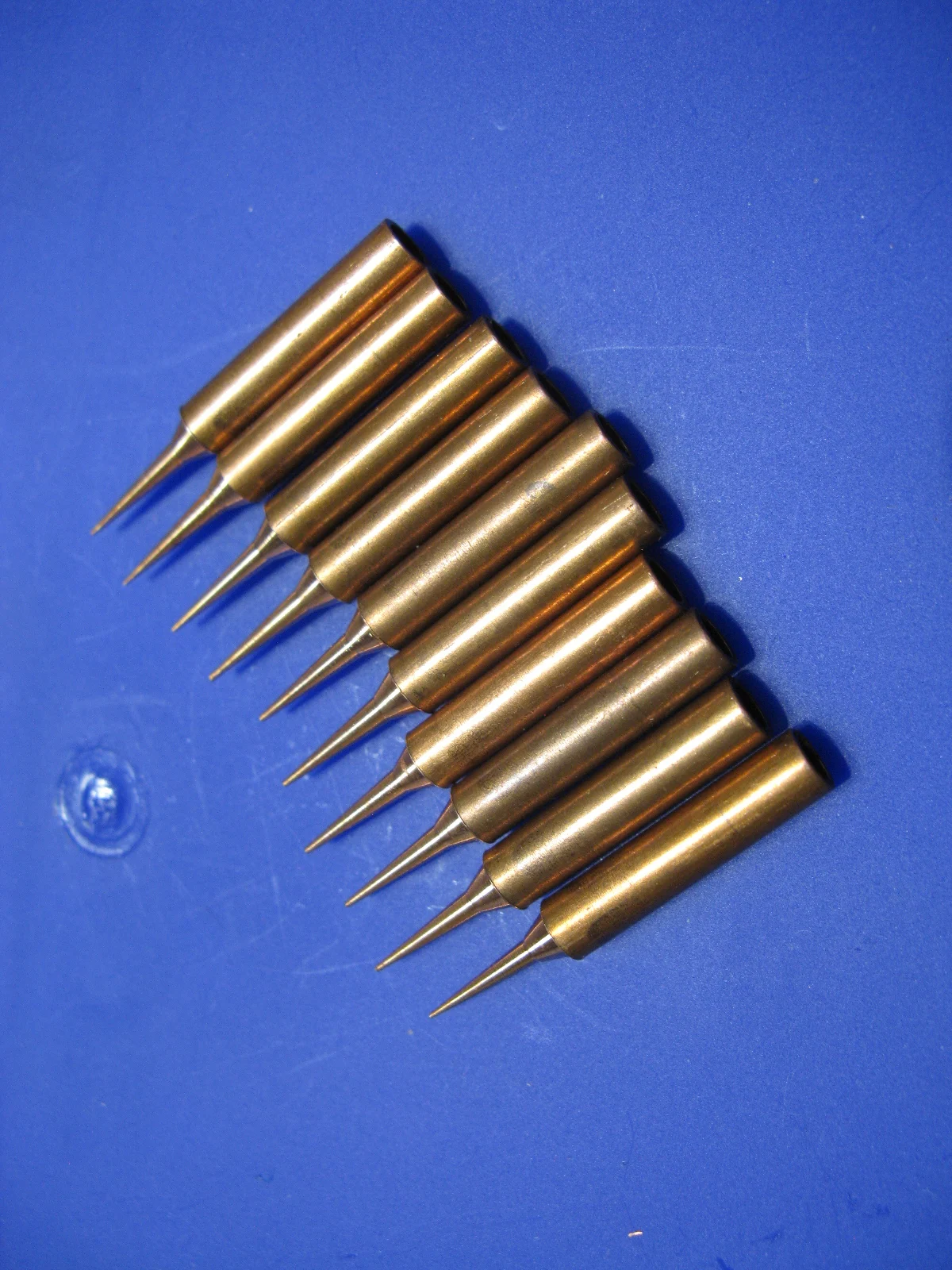 Обычные, точёные из медного прутка наконечники. Был бы материал и к кому обратиться, можно было бы и не покупать. Пришли быстро. Проверил - подходят. Выточены грубо, без обработки - прошлись фрезой, высверлили отверстия, заточили наконечник. Ну за свою цену сойдут.
