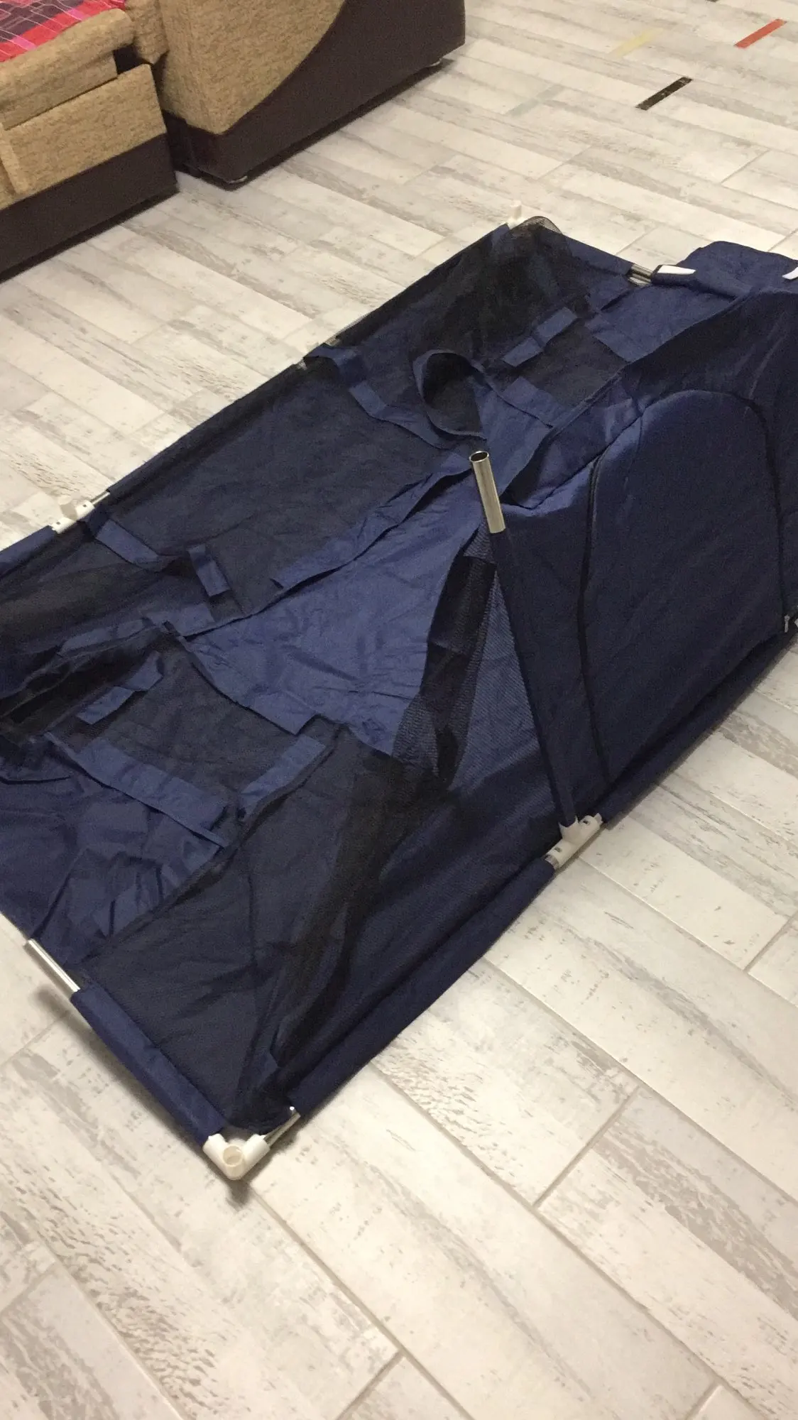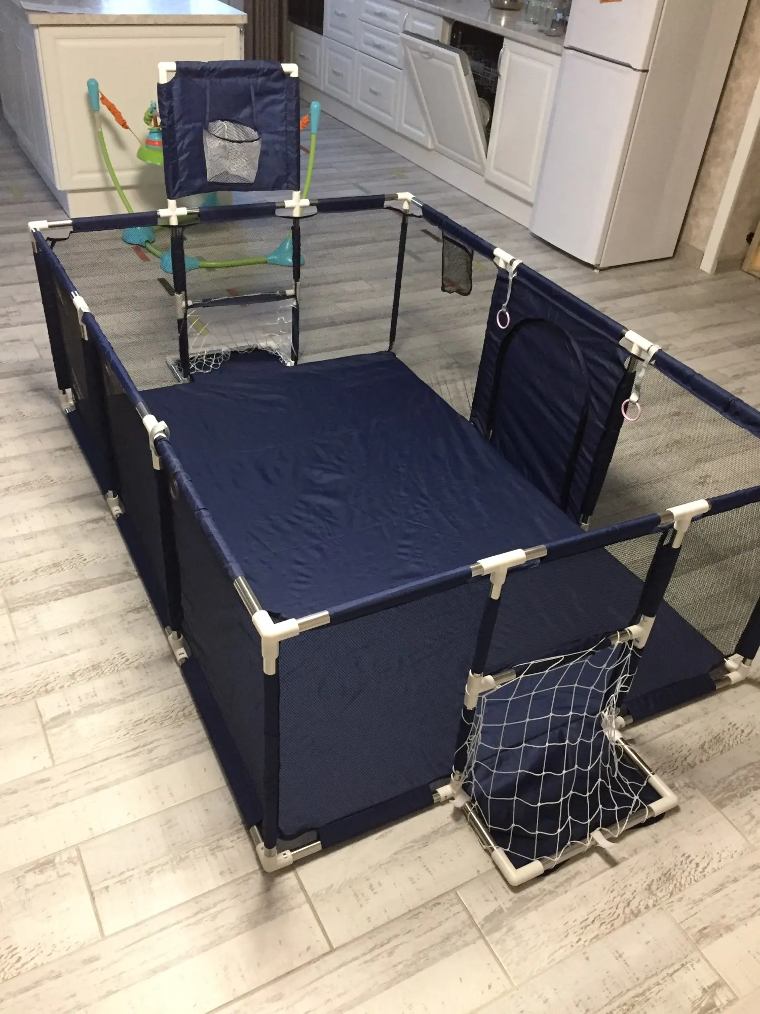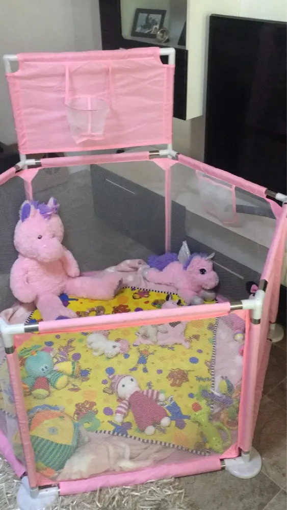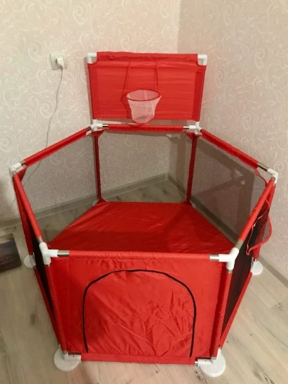 Заказ шёл до Пермского края 2нелели, трек отслеживался. Доставка из России, может из Москвы, точно не скажу. Товар пришел в кордонной каробке, метр в длинну и 40 или 50см по бокам гобаритный и не сказать что лёгкий. Запчасти для сборки лежали в отдельных пакетах, инструкция по сборке тож имеется, но не на русском и непонятно. Тихонько сам разобрался, все просто собирается и разбирается, трубки металл около 1-2мм на ножках есть присоски к полу. Манеж не рвется хотя ребенок руками и ногами телом виснет на нем, пару ниточек торчало только около баскетбольной сетки. Минус продавцу не продумали Маттиас туда в манеж, ткань стелиться на твердый пол, ребенок в любой момент может упасть,сесть носом кликнуть об пол!! Брал с баскет сеткой за 2460р