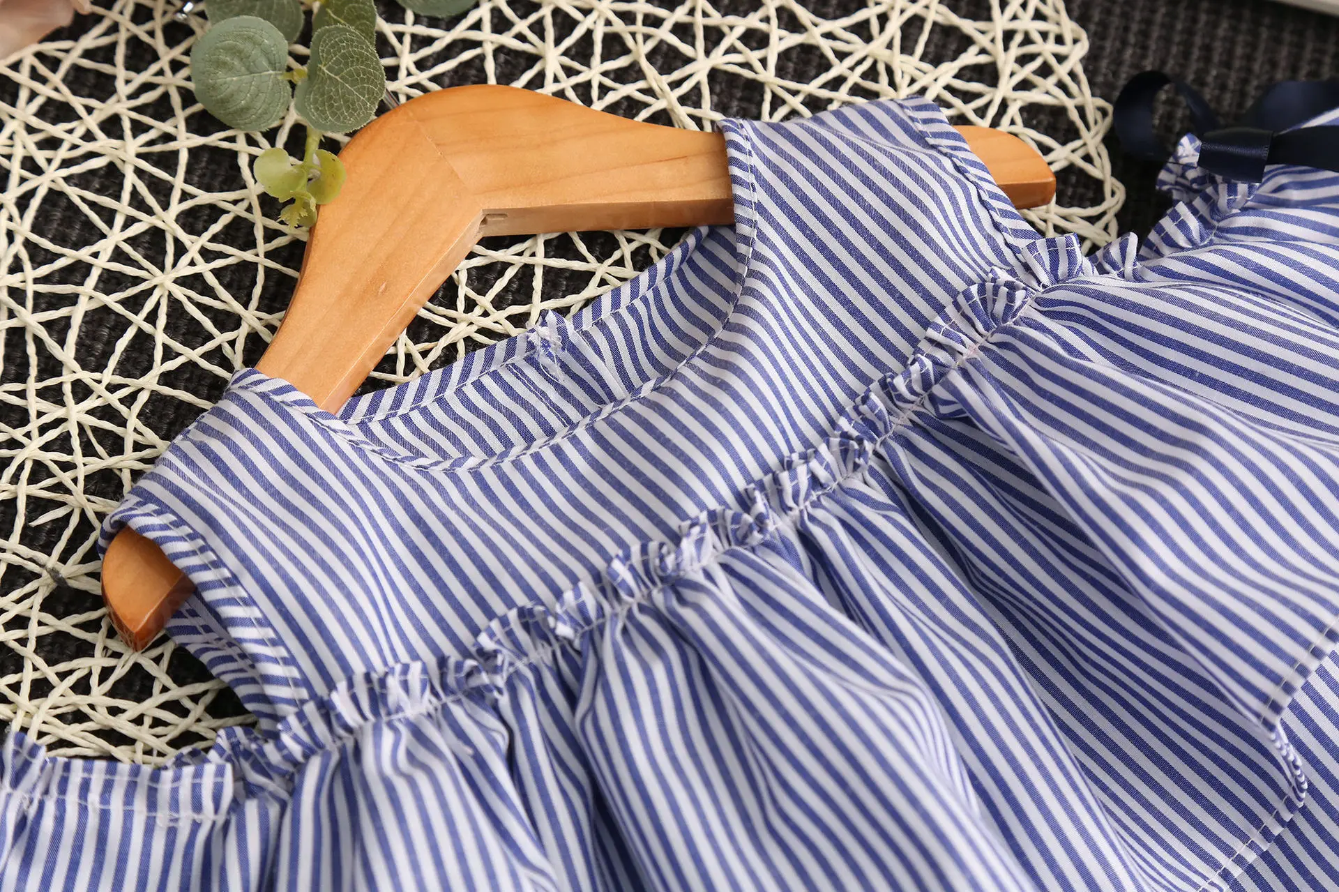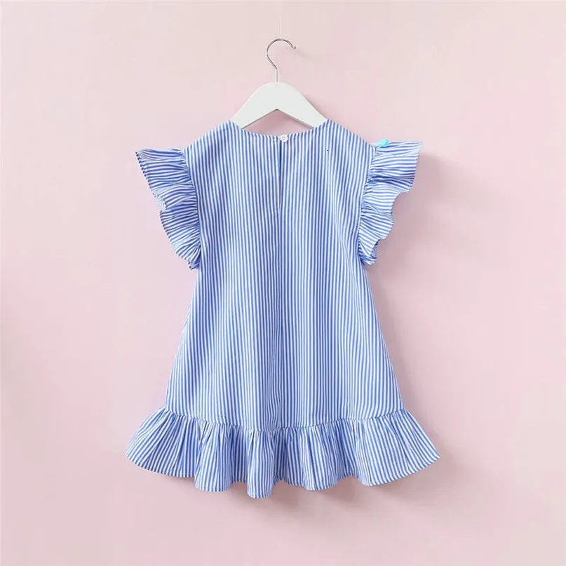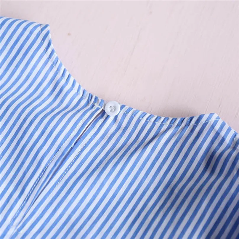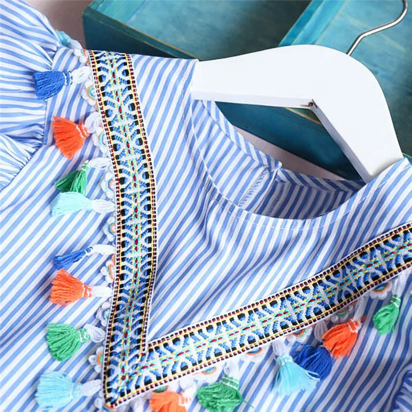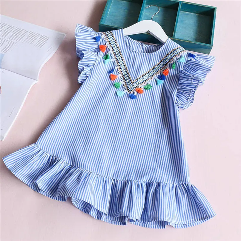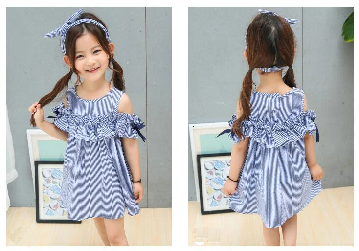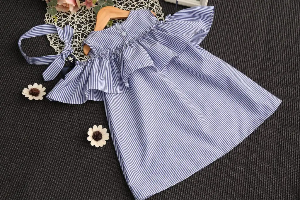 Платье для девочек, летнее платье для маленьких девочек, милая одежда для дня рождения, вечерние платье в синюю полоску с открытыми плечами и оборками, 2018