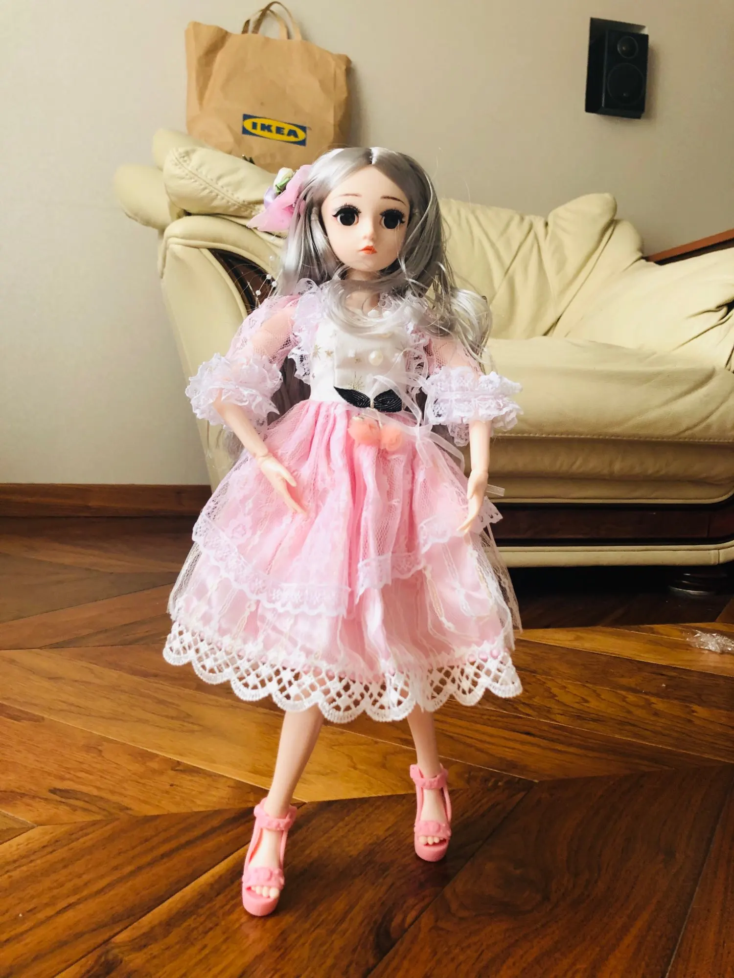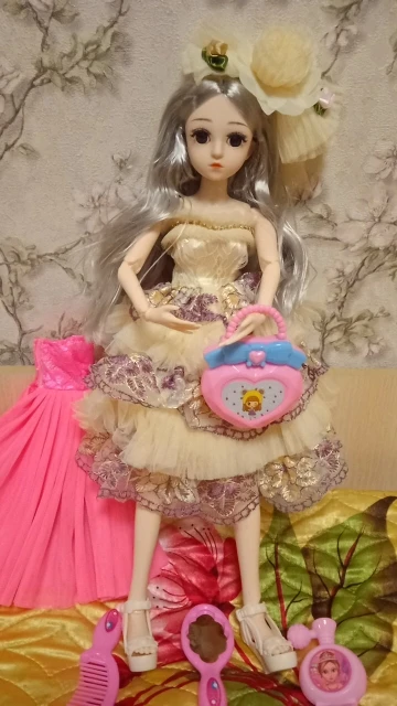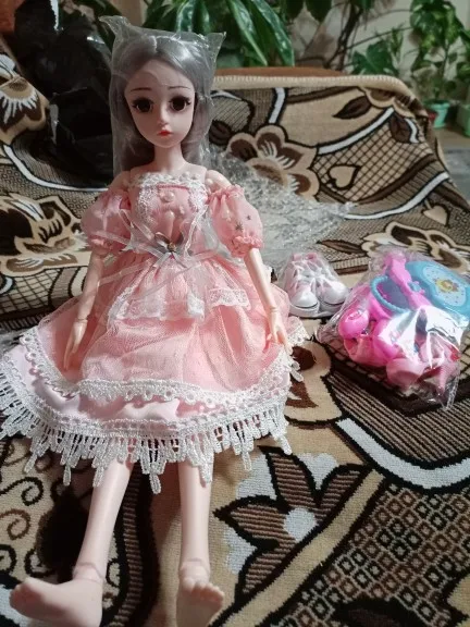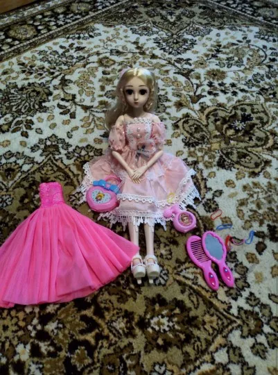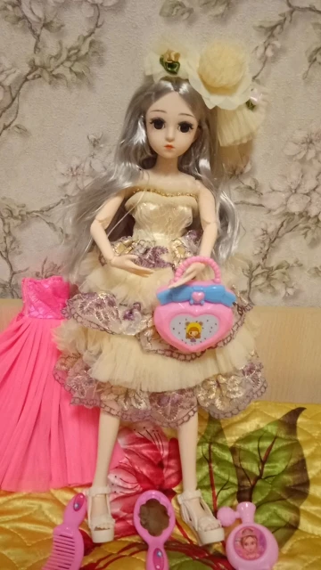 Кукла большая, красивая в красивом платье, с акксессуарами и запасным платьем. Части тела сгибаются, сразу туговато, но затем уже легче. Дочери понравилась, только сказала, что кукла грустная) Доставка из России, но конечно, транспортная компания заставила понервничать. Неделю болталась посылка в областном городе. Продавец просто душка! На Али таких ещё не встречала, отвечал на все сообщения и поддерживал!