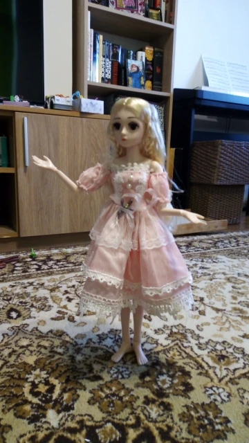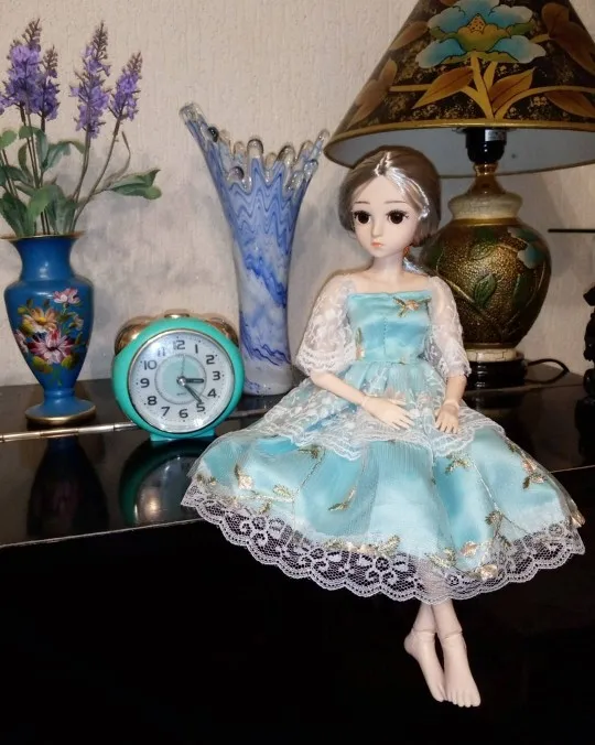 Кукла прекрасная, очень пропорциональная, с милым нежным лицом. Брала ее просто для души, в качестве украшения интерьера, и очень довольна. Одежда из красивой ткани (платье чуть-чуть кривовато сшито, но это незаметно), прилагается набор пластиковых аксессуаров, в том числе туфли. В качестве подарка (?) вложено ещё одно платье (розовое). Шарниры на руках и ногах очень тугие, чтобы в первый раз их согнуть, нужно приложить усилие, как пишут в других отзывах. Зато кукла хорошо держит заданную позу. Есть небольшие погрешности в отливке шарниров, легко устраняются канцелярским ножом. Волосы у куклы очень красивые, хорошо прошиты и не лезут. Единственный момент - у этой модели завязать два хвостика/косички не получится, прошивка под определенную прическу либо под распущенные волосы. Кожа головы прокрашена в цвет волос, это большой плюс. В целом - товар очень понравился, продавцу большое спасибо!