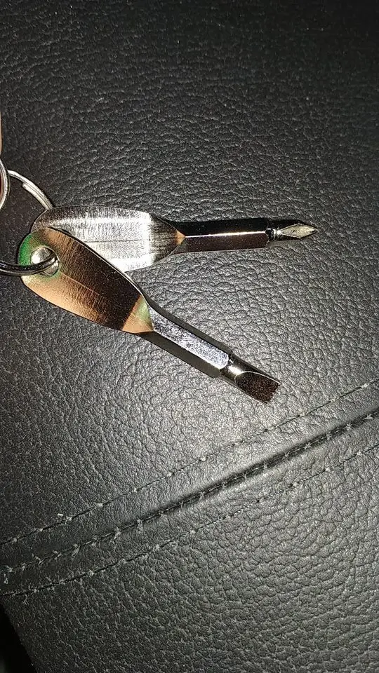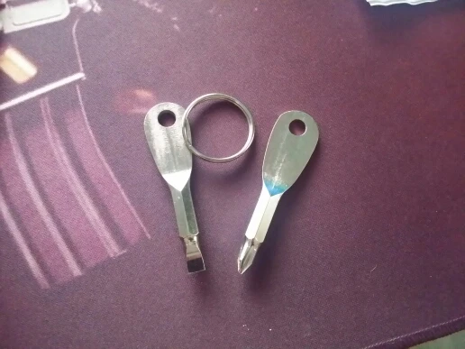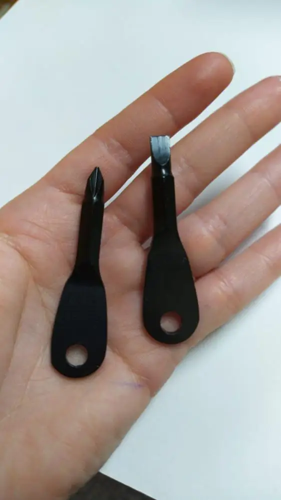 Пара прикольных брелоков. Кольцо в комплекте. Размер жала чуть меньше чем N2, но значительно больше N1. Размер изделия совпадает со стандартным ключом. Чистота обработки поверхности - средняя, заусенцев и острых граней нет. Откручивать стандартный черный саморез им получается. Грани во время испытания не замялись, это даже удивительно. Закрутить саморез без предварительного засверливания в новое место будет очень сложно, думаю такой фокус получится только у тех, кто гайки до 32 пальцами закручивает))) Но ждать такого удобства от брелка как то излишне))) Полностью отвёртку не заменит, но для работ типа "по-быстрому отрегулировать навесную дверку шкафа" пойдёт. Отверточки поселились на ПМЖ в основную связку ключей.