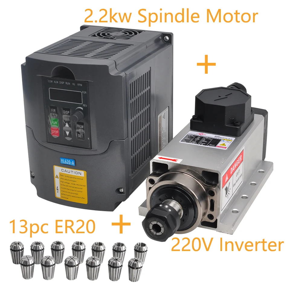 Комплект 2:2.2KW с воздушным охлаждением мотор шпинделя + 220V VFD инвертор + 13 шт ER20 цанговый(1/2/3/4/5/6/7/8/9/10/11/12/13 мм)