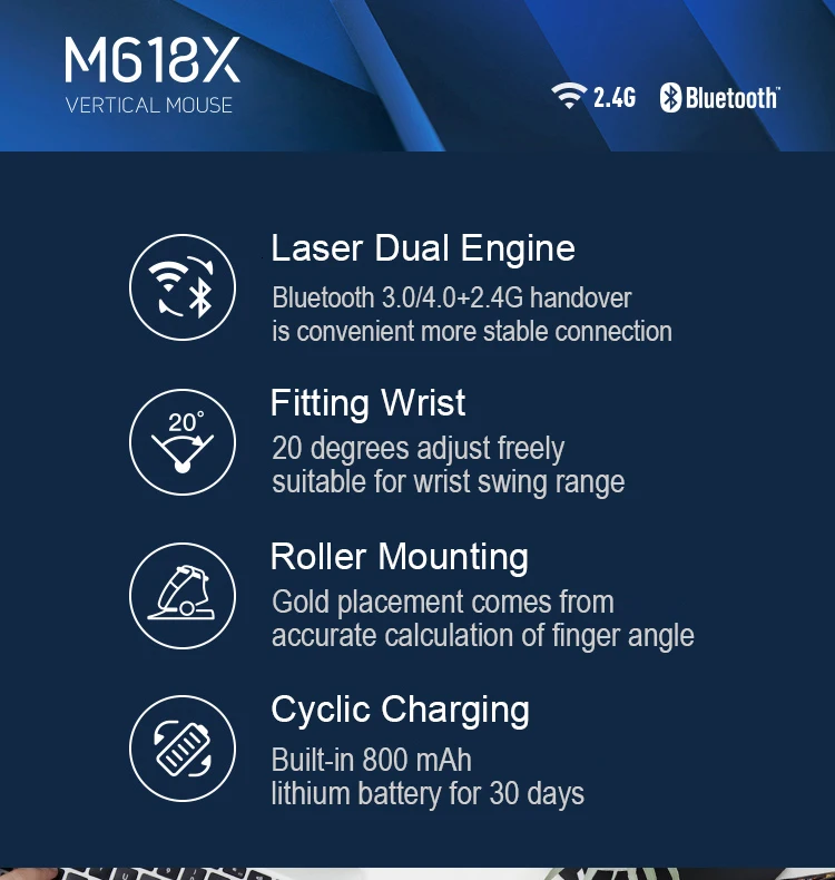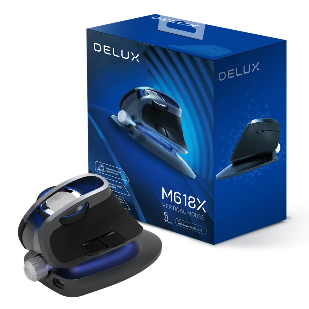 Delux M618X 2,4G Беспроводная + Bluetooth 3,0/4,0 многомодовая мышь, перезаряжаемая USB эргономичная Вертикальная мышь, Офисная игровая 6D мышь