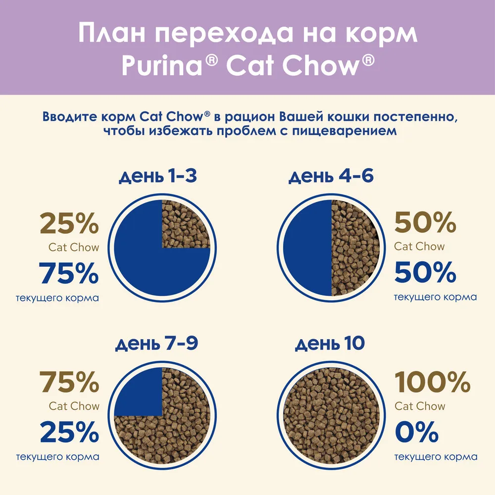 Purina® Cat Chow® (Пурина Кэт Чау) — тщательно разработанный рацион, содержащий белок высокого качества и натуральные ингредиенты, такие как горох, морковь, цельнозерновые злаки, цикорий и дрожжи. Корм Cat Chow® с высоким содержанием домашней птицы. Для удовлетворения естественных потребностей Вашей кошки более 50% белка в корме (от общего количества белка) составляет белок животного происхождения. В составе продукта содержится цикорий - натуральный пребиотик, который доказанно улучшает пищеварение и позволяет Вашей кошке получать больше из своего питания. Основываясь на нашей экспертизе с 1926 года, мы разработали полнорационный сбалансированный корм Cat Chow®, в котором есть все необходимое, чтобы жизнь Вашей кошки была здоровой и естественно прекрасной.Мы ежедневно проводим сотни проверок качества на наших фабриках, чтобы Вы получали продукт высокого качества, как и ожидаете. Всегда.