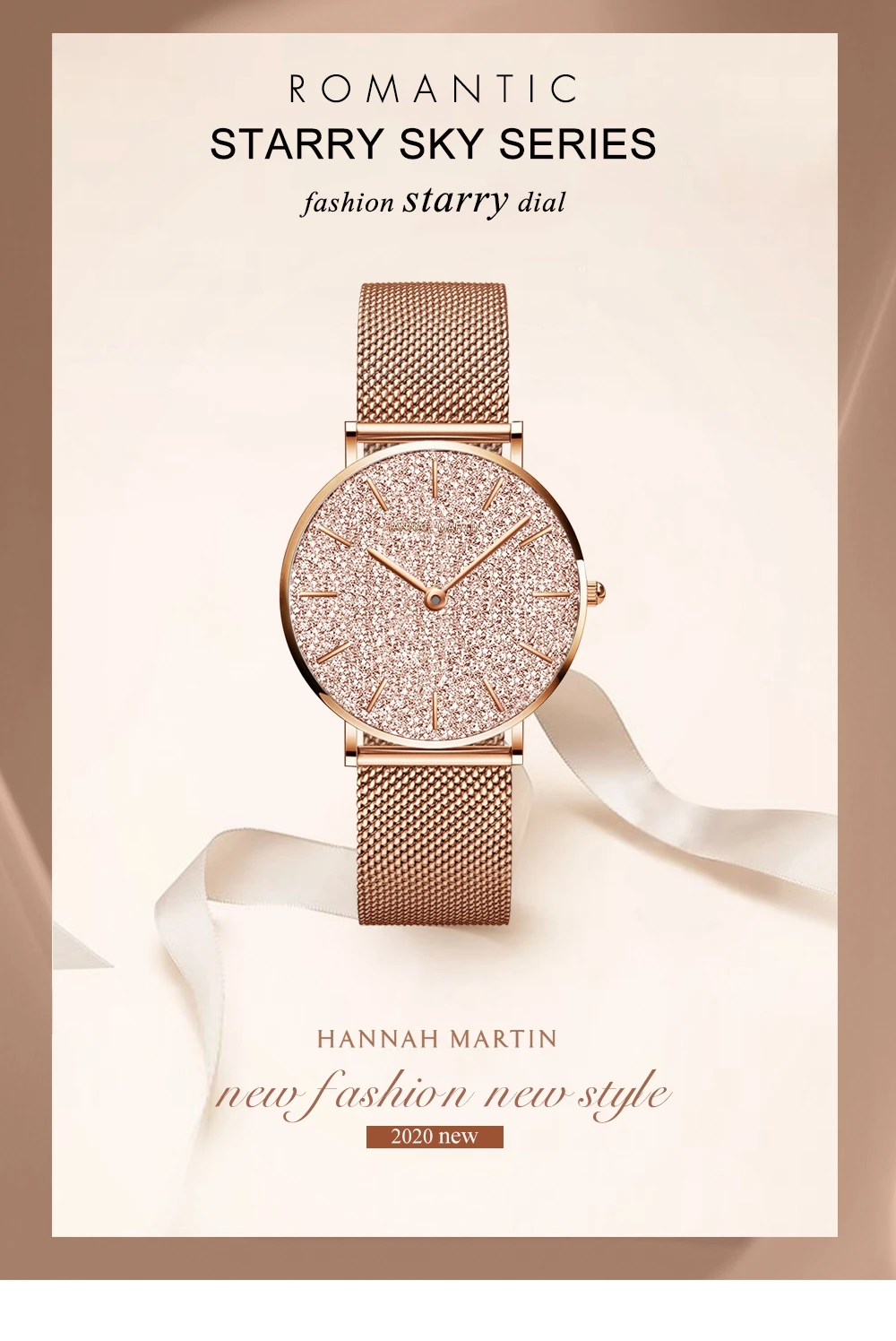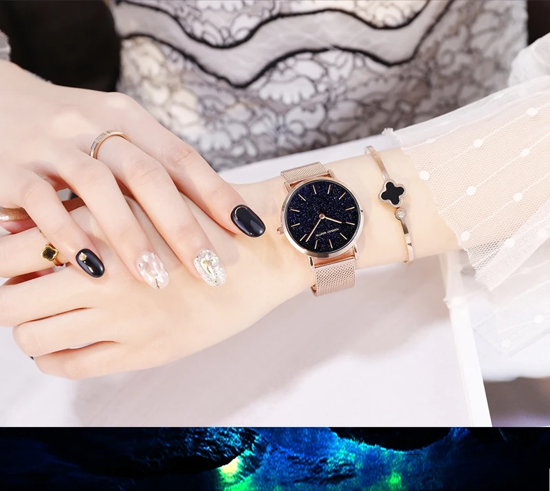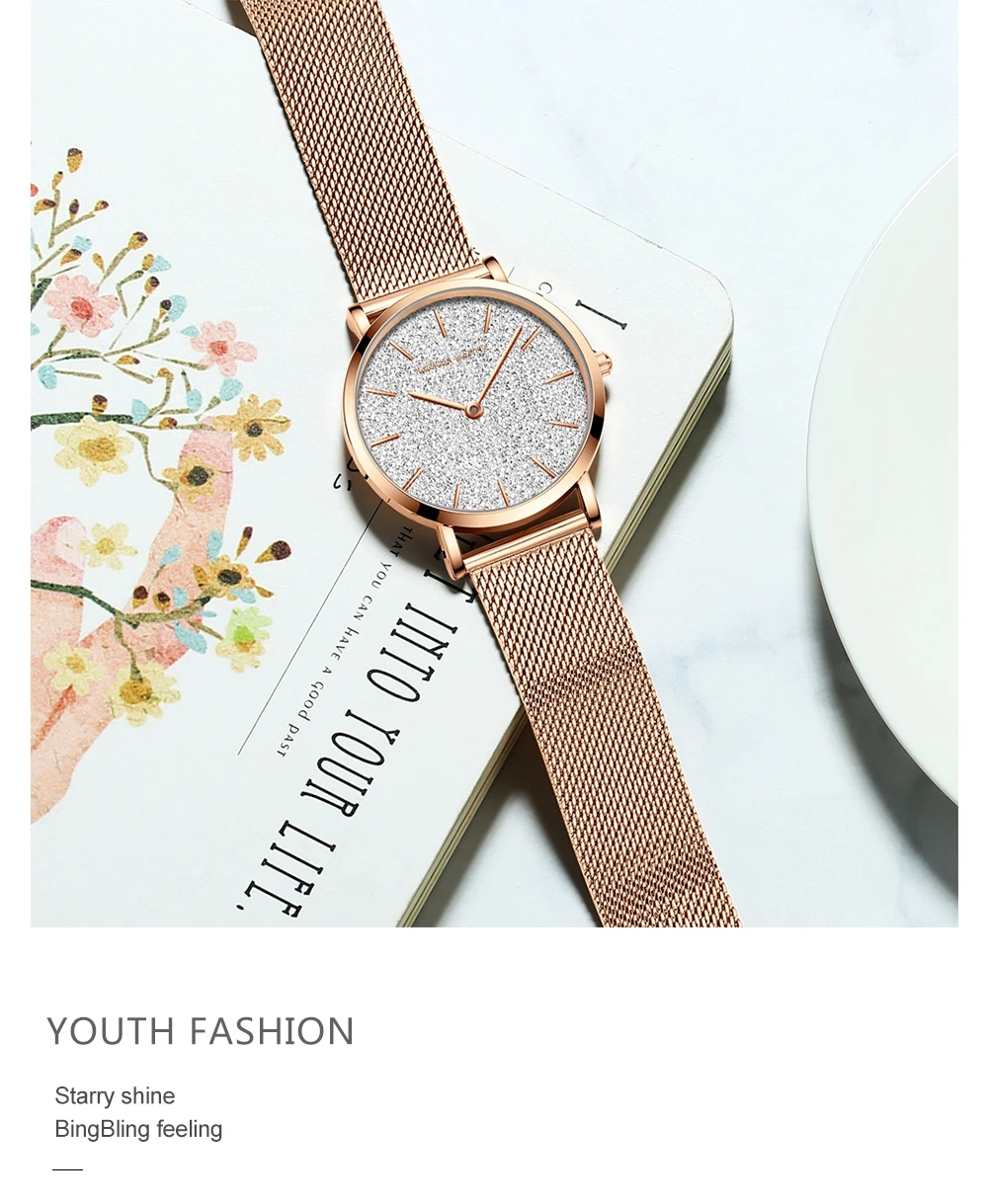 Часы наручные женские кварцевые, уникальные Простые повседневные водонепроницаемые, со звездочками, из нержавеющей стали, с сетчатым браслетом цвета розового золота