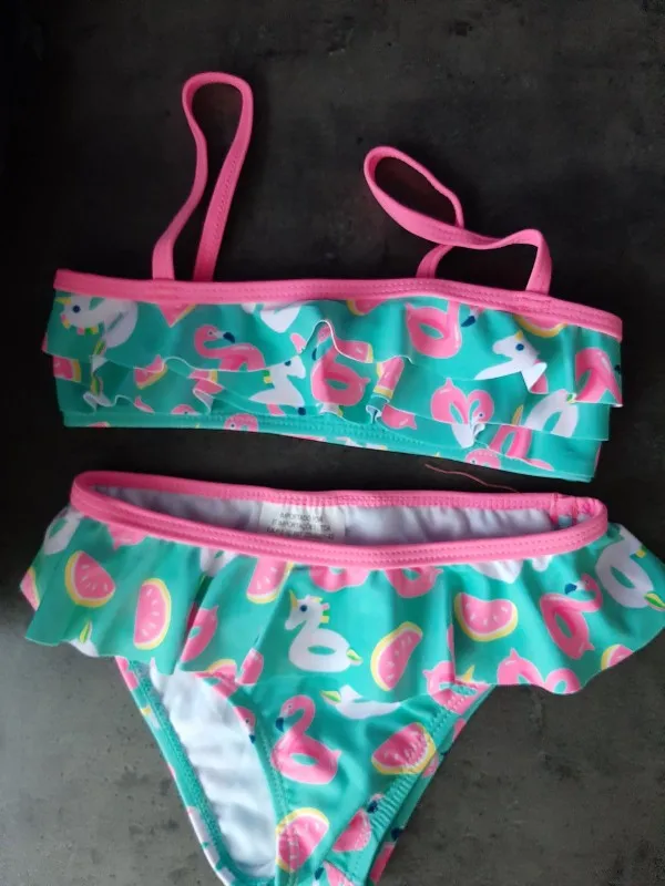 Купальник очень красивый, яркий. Как на фото. Единственное нам он велик немного. У кого ребёнок худенький можно было взять на размер меньше. Брала на 5 лет