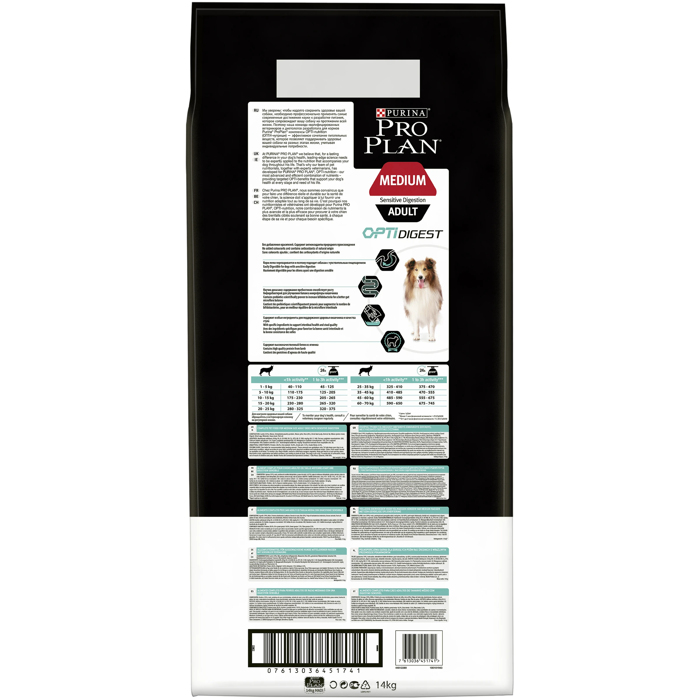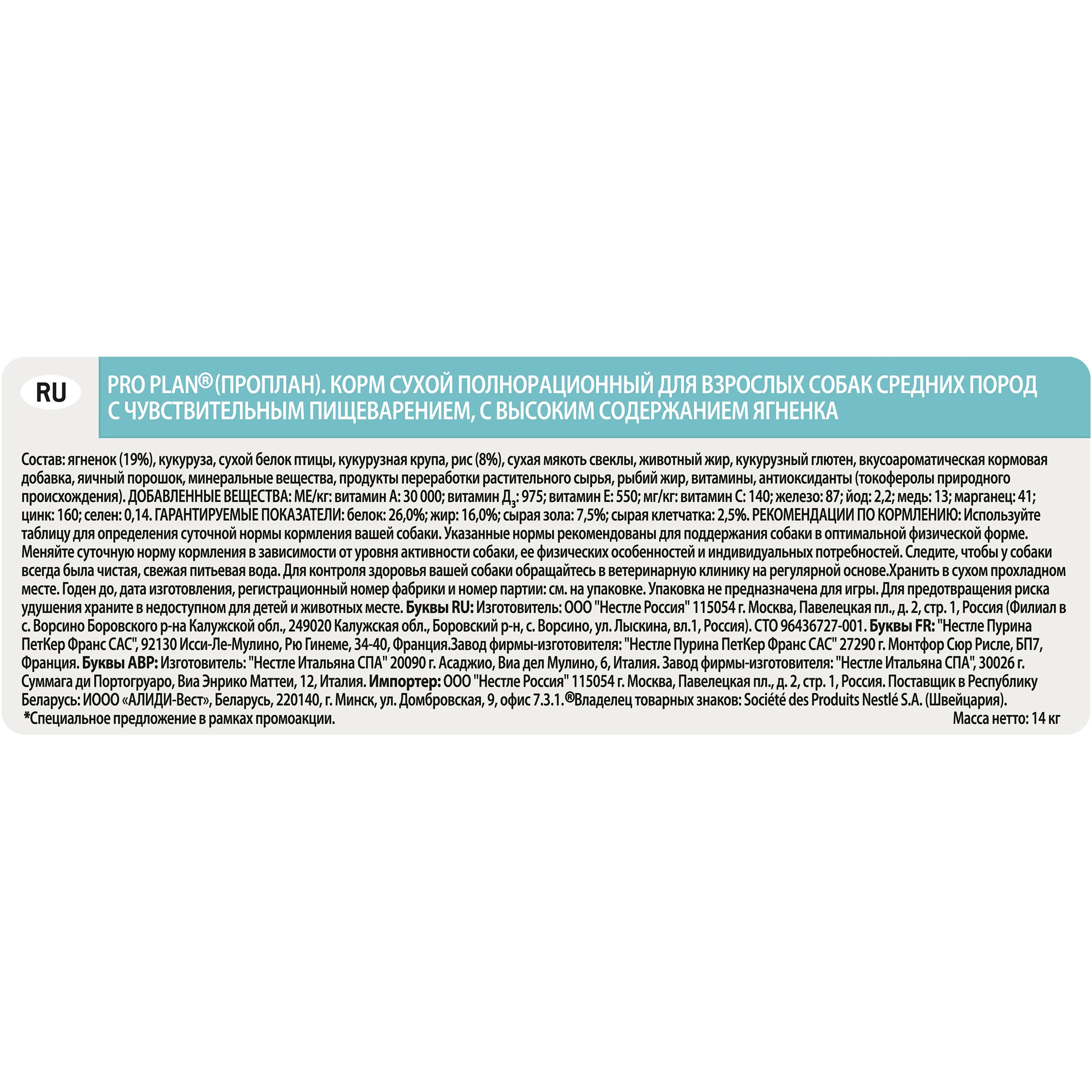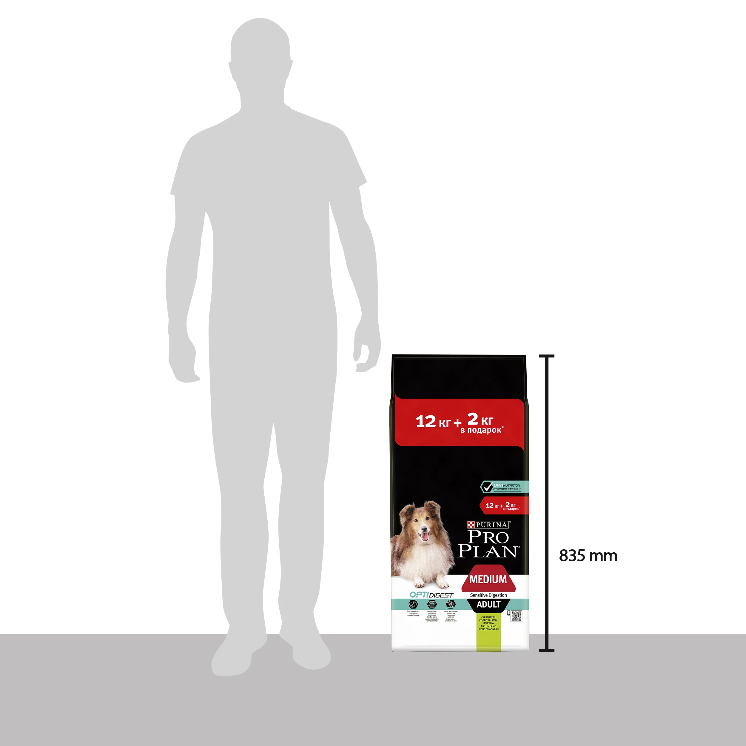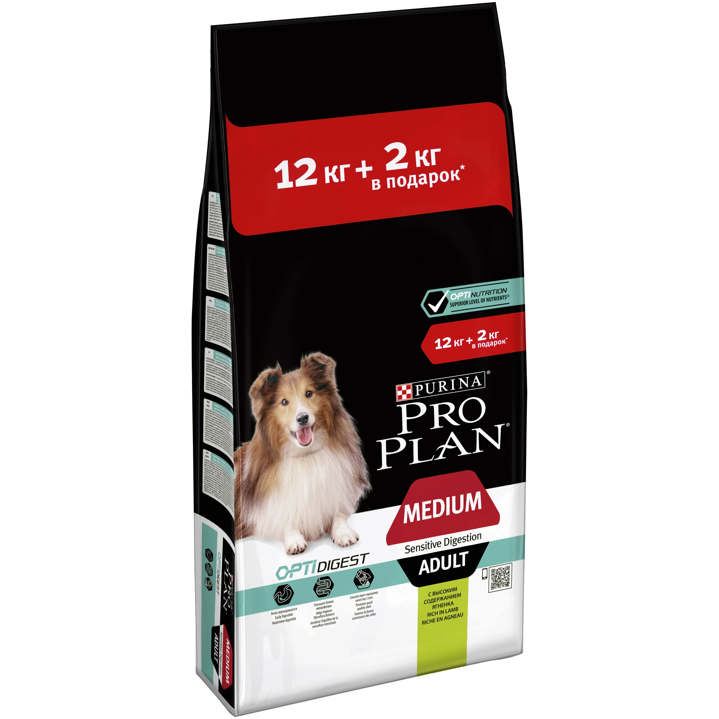 Сухой корм Pro Plan для взрослых собак средних пород с чувствительным пищеварением с комплексом OPTIDIGEST, с высоким содержанием ягненка, Пакет, 12 кг + 2 кг