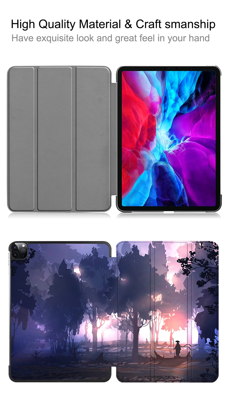 [Трехстворчатая подставка]: Встроенные магниты, складываются в подставку. Трехстворчатая передняя крышка с двумя стоящими позициями для комфортного ввода клавиатуры и просмотра фильмов с углом обзора, который отличается от трехкратного.