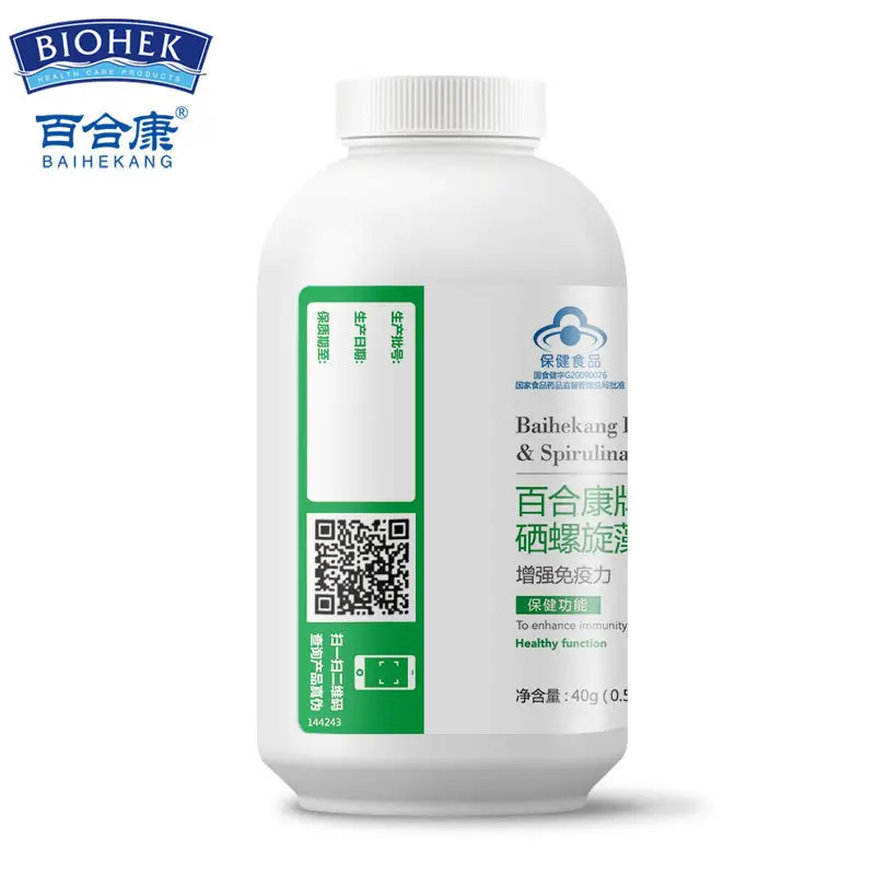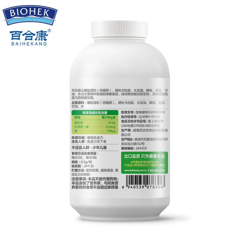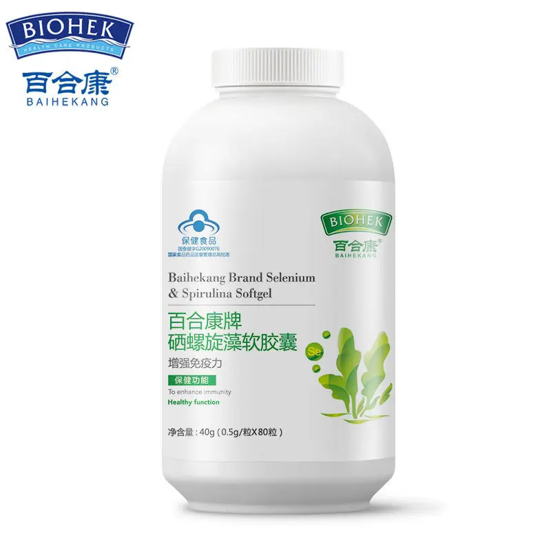 Спирулина, именно это артроспира platensis, который является волокнистой, спиральной нитью, без поперечных стен, синий и зеленый; Нити 4-5 микрон в ширину, длина от 400 до 600 микрон; грибковые клетки тупый наконечник, без гетероциста. Цианобактерии клетки в организме без пигмента, распределение пигмента в прототипах области внешнего пигмента, синий и зеленый. Протопласт внутри бесцветной центральной области, как и другие ядра водорослей, но без нуклеоли и ядерной мембраны, и поэтому принадлежит Спирулина прокаротические растения. Содержание: 80 шт/бутылка Размер: 500 мг/таблетка Активные ингредиенты: порошок спирулины, селен Инструкции: для взрослых, принимайте по два (3) софтгеля каждый раз, три раза в день, предпочтительно с едой. Функция: 1. Спирулина имеет функцию лечения гипертонии 2. Спирулина может лечения желудочно-кишечных заболеваний, язвы желудка и duoцатиперстной кишки 3. Спирулина может предотвратить диабет и катаракту