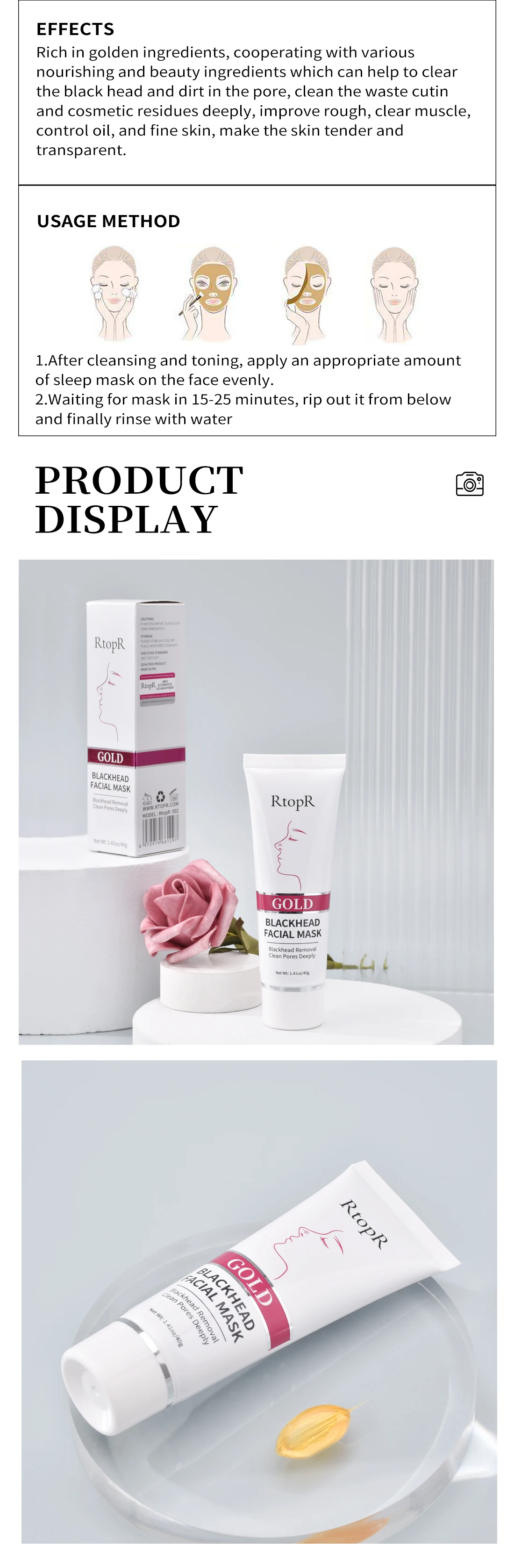 Содержит золотые ингредиенты, сотрудничая с различными питательными и косметическими ингредиентами, паста мягкая и деликатная, которая помогает очистить черную голову и грязь в пор, очистить отходы кутина и косметические остатки, И улучшает грубость, прозрачность мышц, контроль жирности и тонкой кожи, Чтобы сделать кожу нежной и прозрачной.