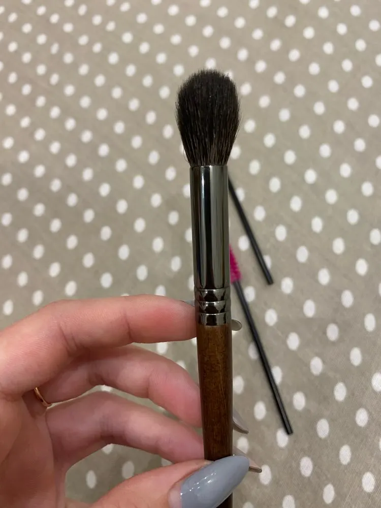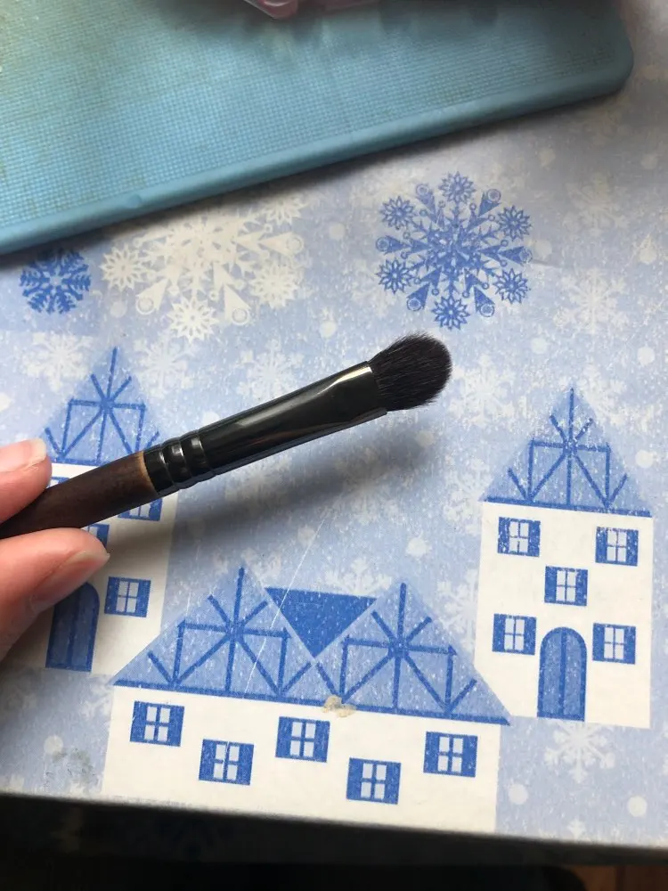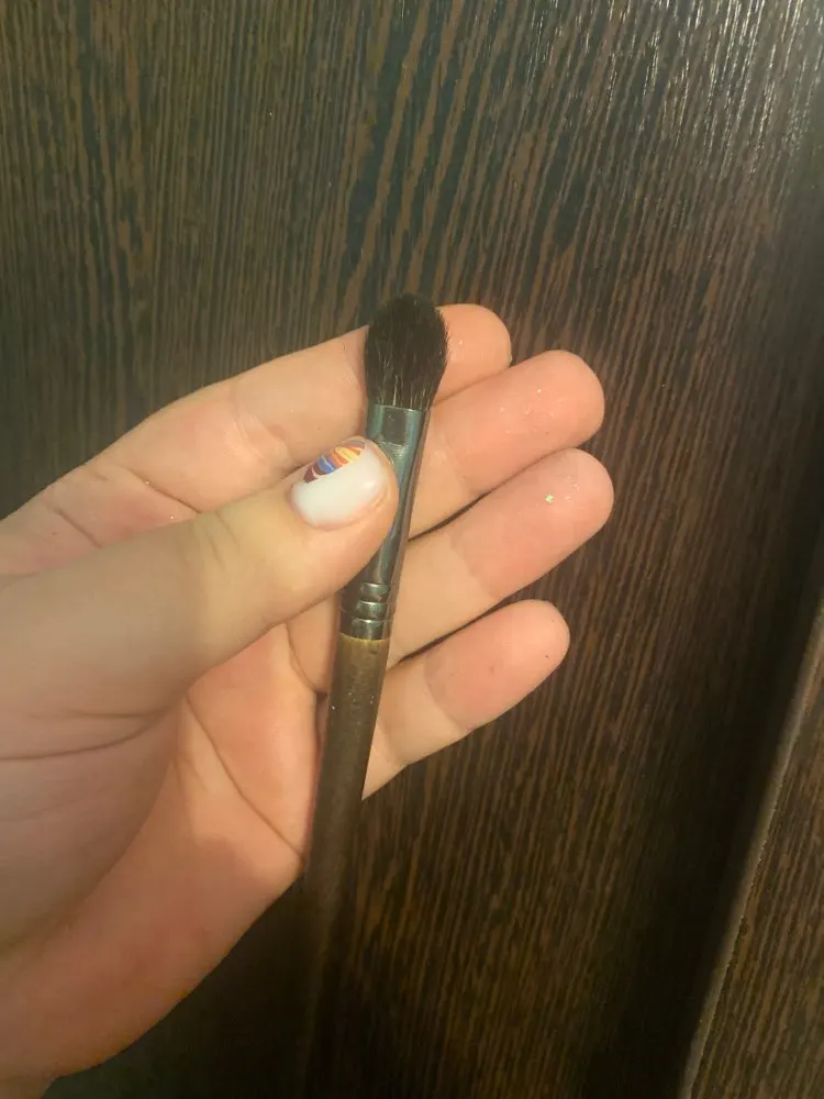 Люблю эти кисти. Эту брала для проработки мелких деталей. Шимерные тени хорошо набирает и переносит.