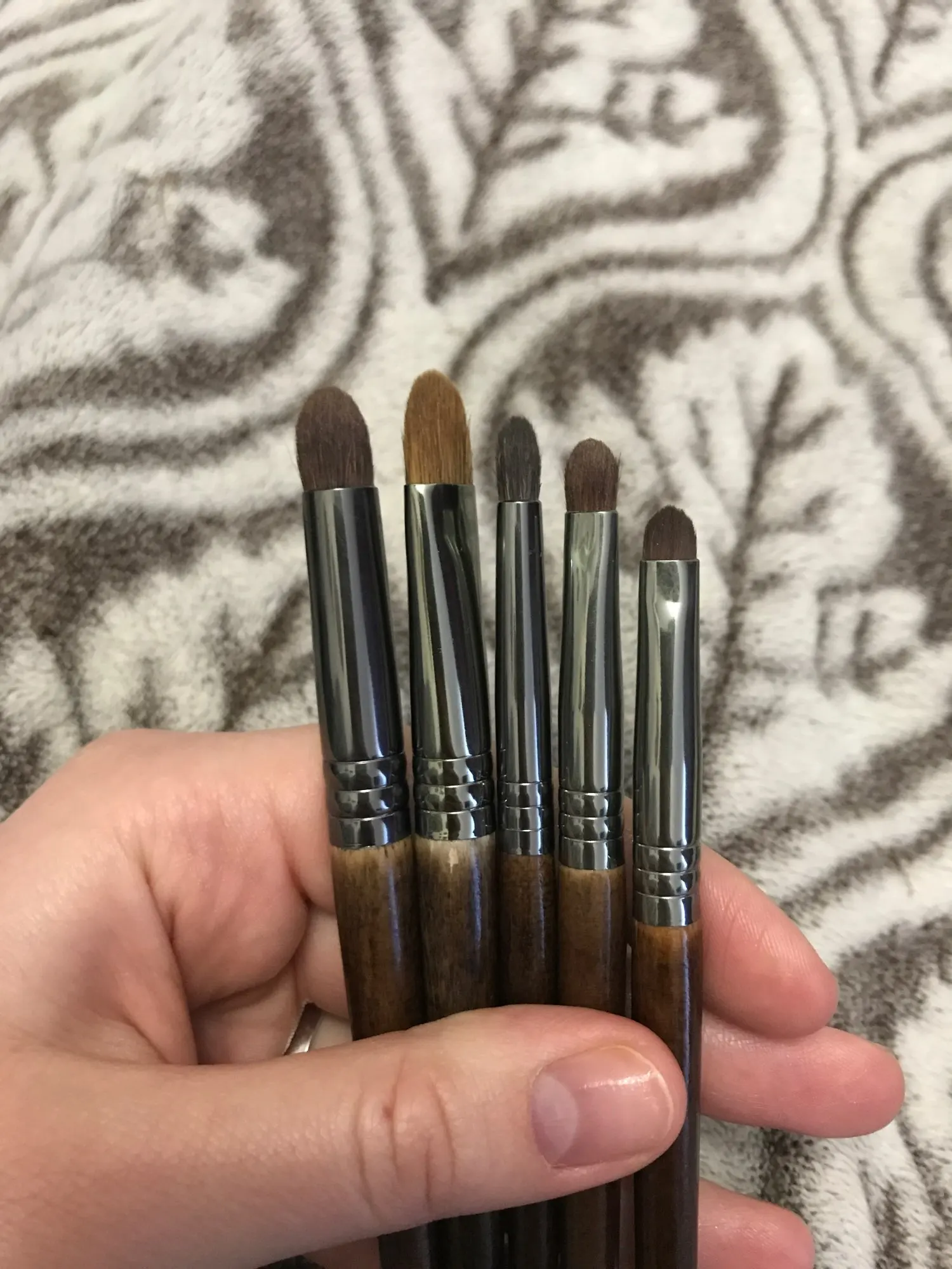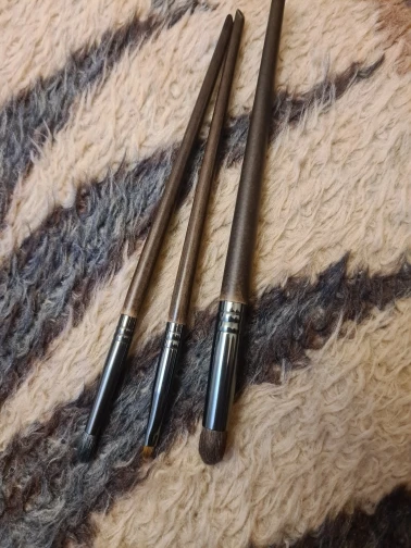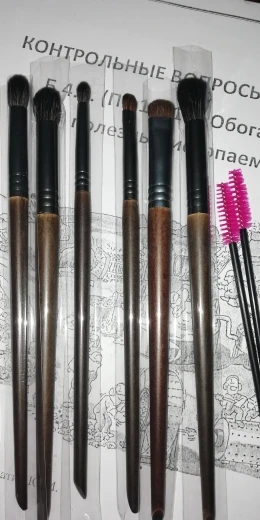 Кисти хорошие, я уже много разных кистей испробовала и дорогих и не очень, эти самые классные, очень хорошо набитые и мягкие, хорошо передают цвет на веко, пользоваться приятно, тушуют тени как надо. Очень похожи на натуральные, может так и есть, не разбираюсь. Выглядят очень классно, не поняла дерево или пластик, но красиво. Пришли быстро. Советую. Классные 100%..Одна кисть за 150 рублей, но я не пожелела что взяла