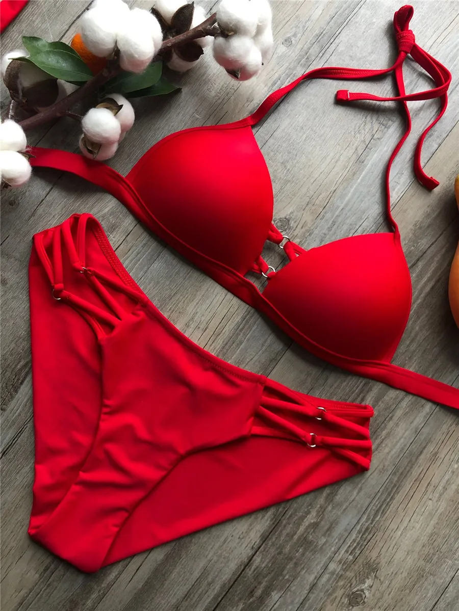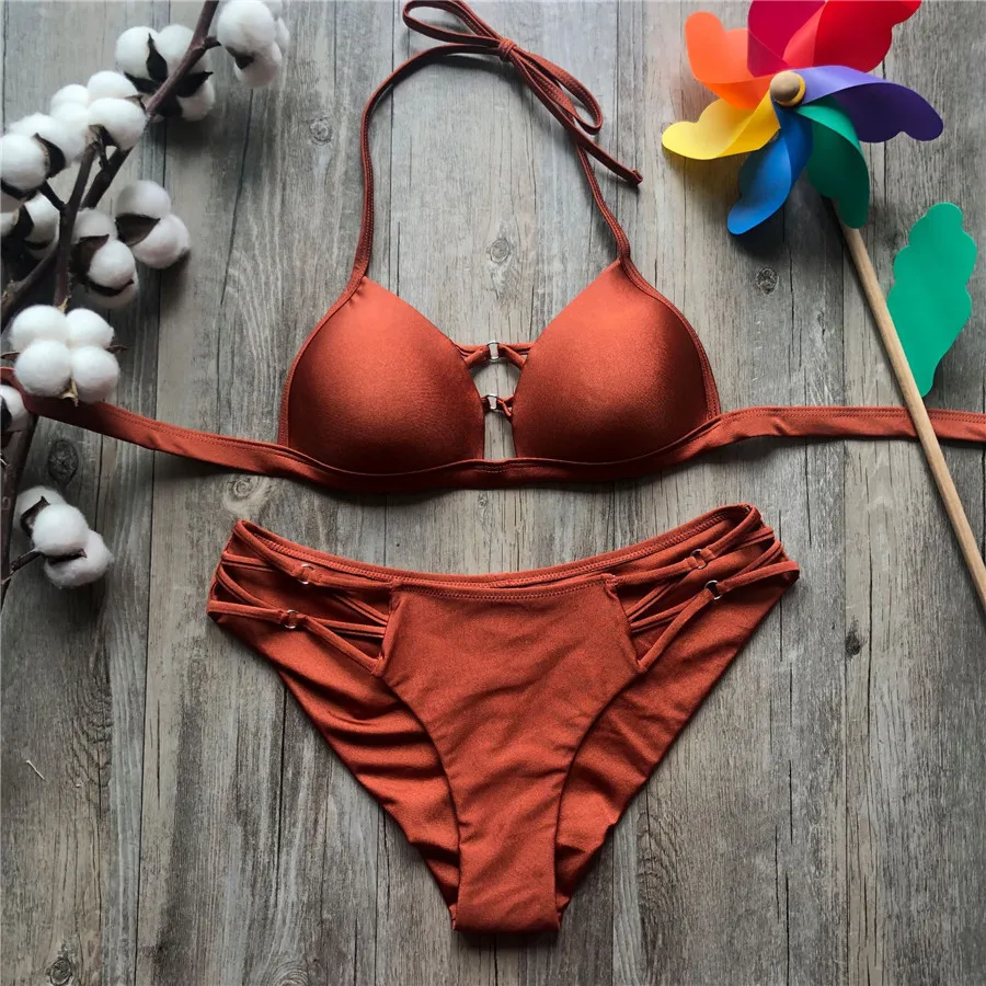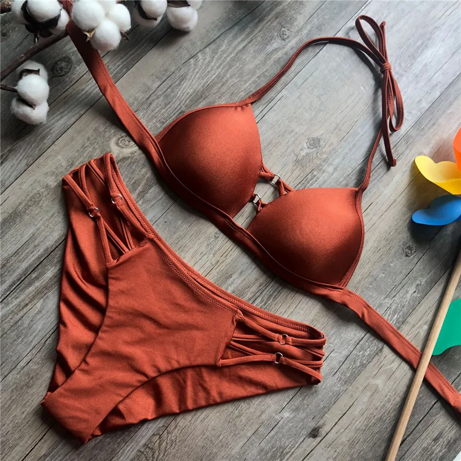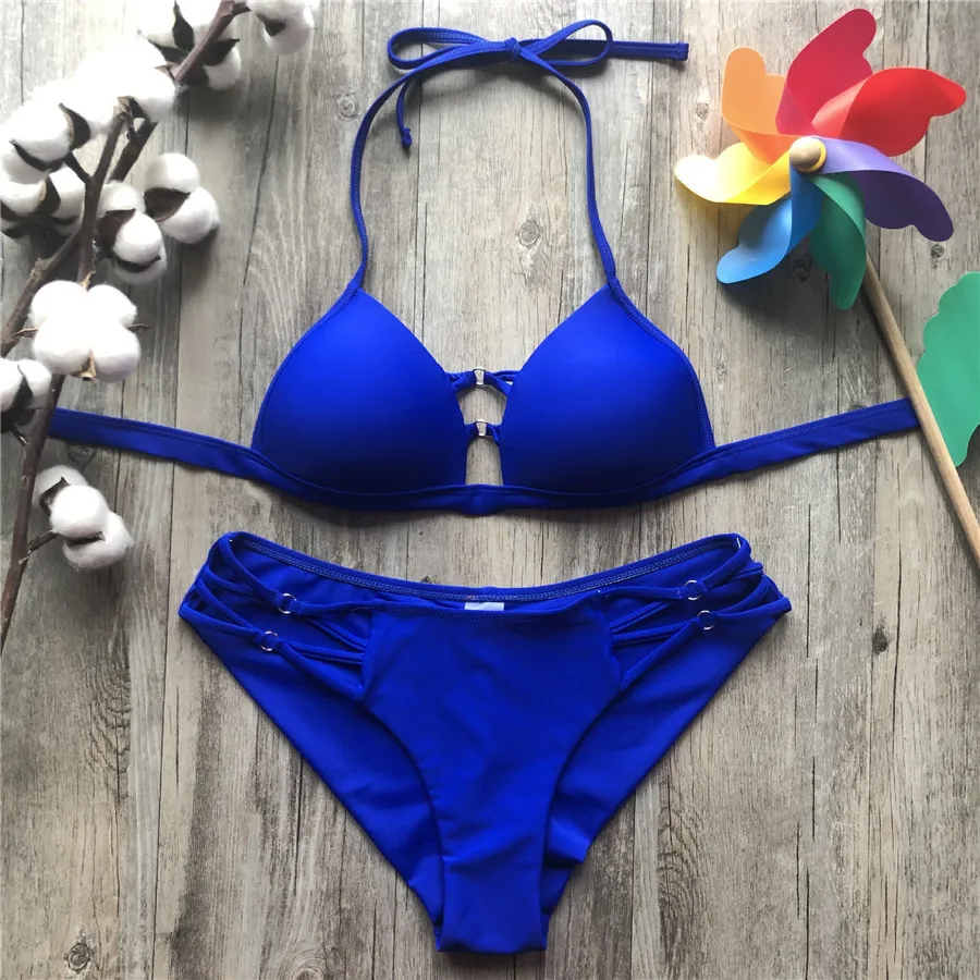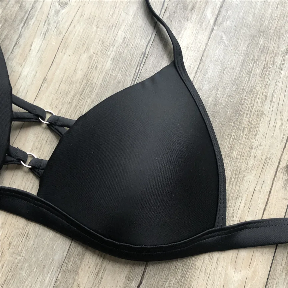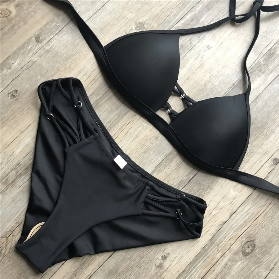Сексуальный комплект бикини на бретелях 2019, купальник с лямкой на шее, купальный костюм с открытой спиной, однотонное черное бикини, Бразильское бикини, купальник пуш-ап для женщин
