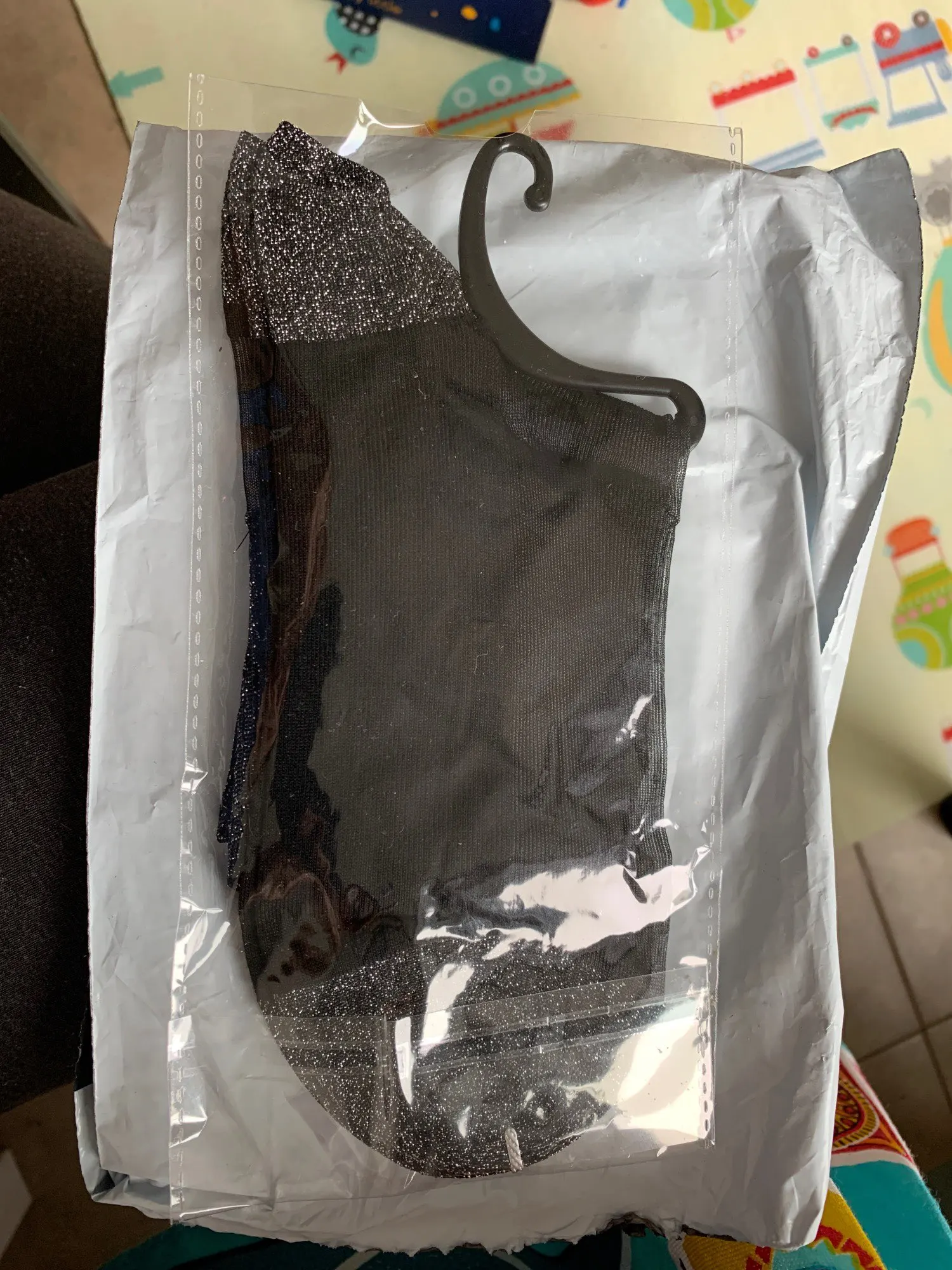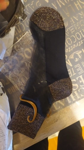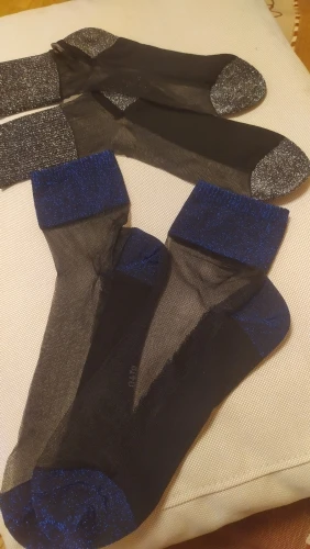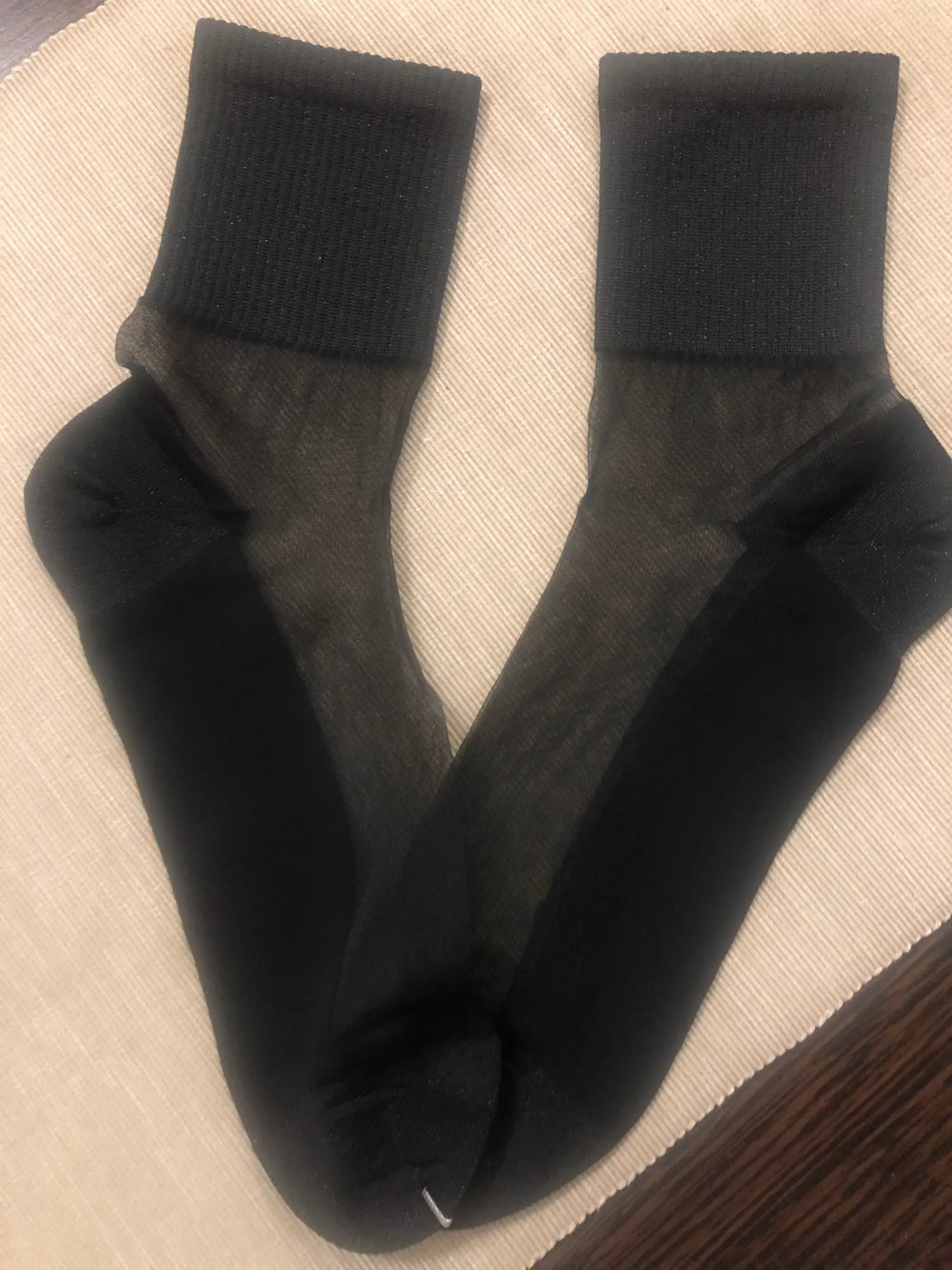 Носки пришли быстро, без затяжек. Но странные. Резинка плотная, в цвет пятки и носка. Сама подошва чёрная, стык с прозрачной верхней частью неаккуратный. Не знаю, в общем...