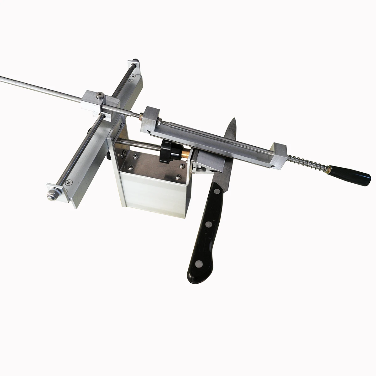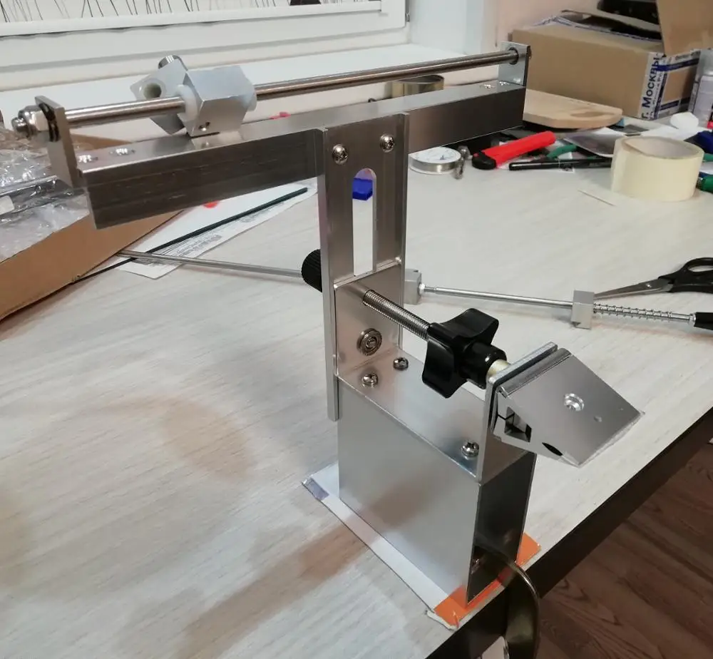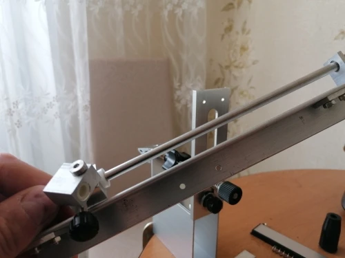 хорошая точилка. нож крепится горизонтально, так что угол заточки легко выставить по уровню. пришлось немного повозиться с камнем от другого поставщика, немного разные размеры не позволяют крепко зажать сразу оба камня. так что берите сразу одним комплектом все камни. в направляющих втулки из фторопласта, должны жить дольше чем просто алюминиевые. все болтики протянул, конструкция надёжная, можно смело брать.