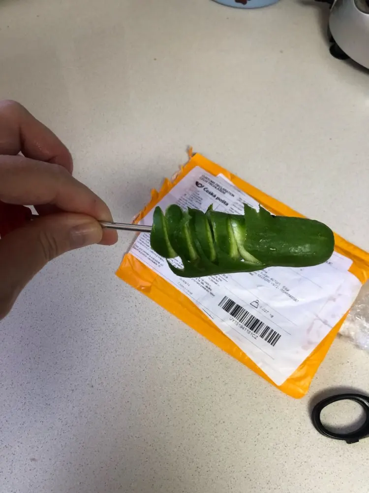 Пришла в течении месяца, такая маленькая штучка, сначала подумала, что положили совершенно не то, потому что больше похожа на отвертку. Но потом поняла что к чему. По фото посмотрите ) в действии не пробовала, думаю силу нужно применить по любому. Особенно на огурце. А так нареканий нет. Упаковано хорошо, трэк отслеживался, с продавцом не общалась