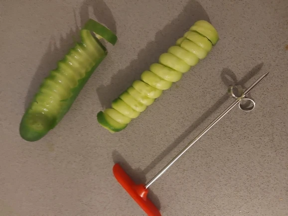 прикольная штуковина, конечно надо подбирать диаметр овоща чтобы отходов меньше было, пробывал на огурцах и редисе, для декорации блюд очень даже нормально!