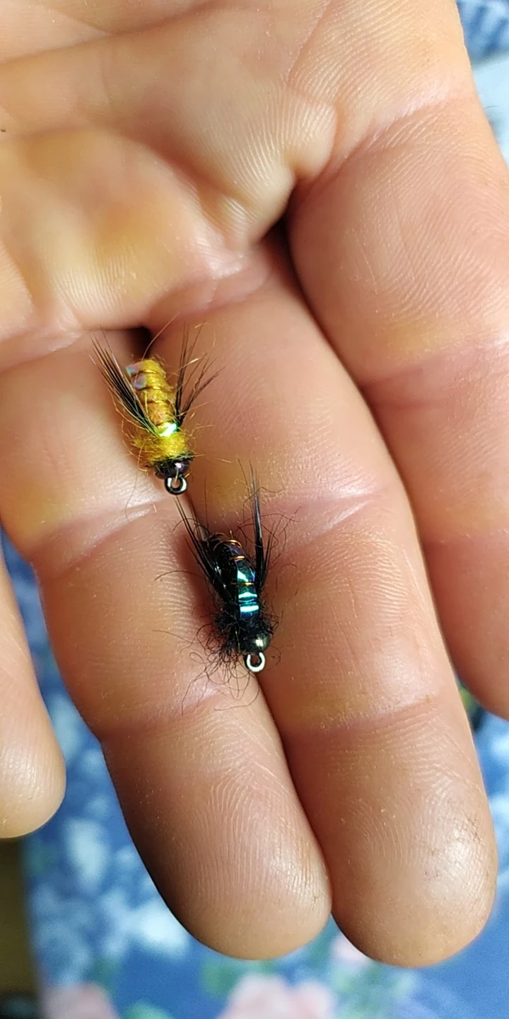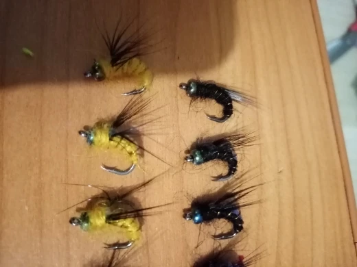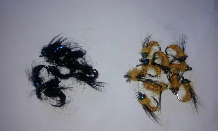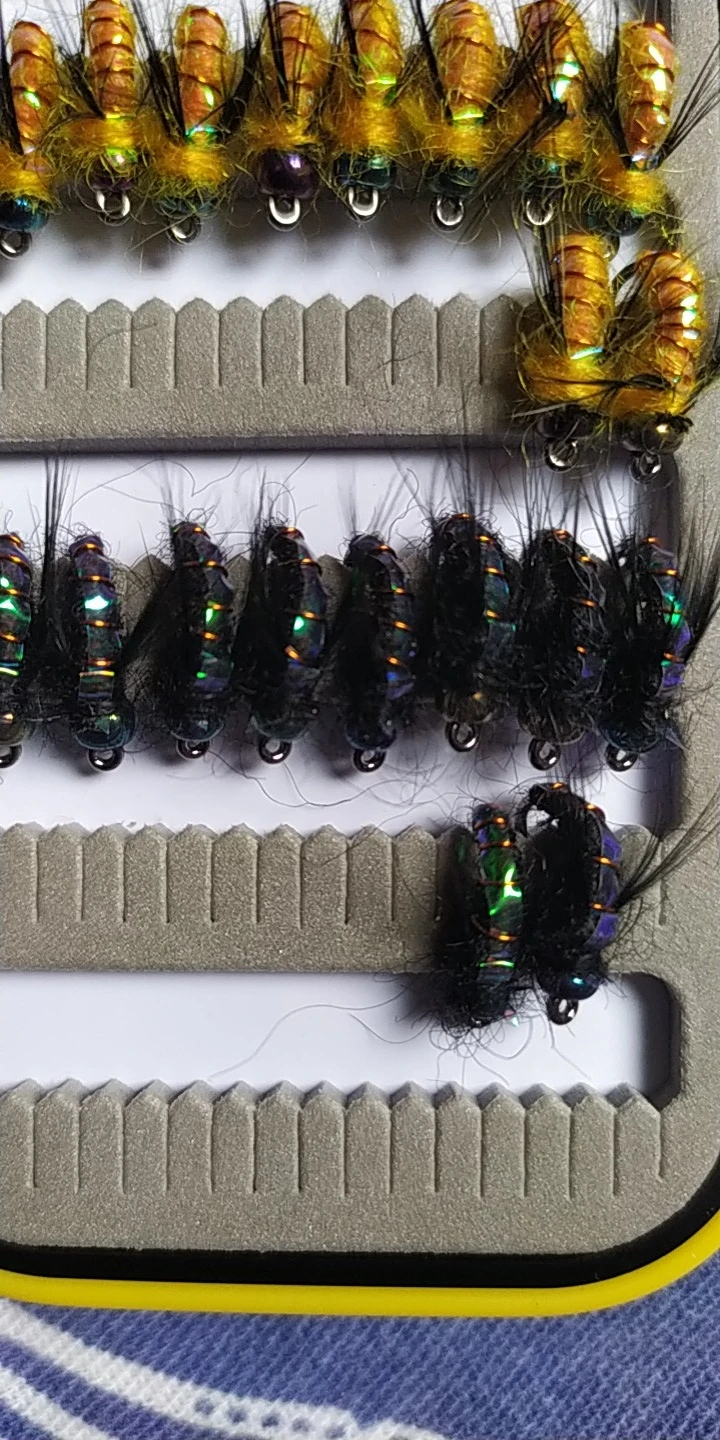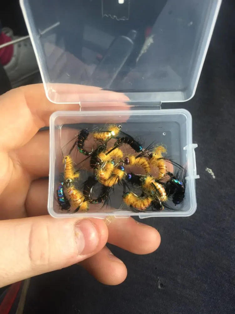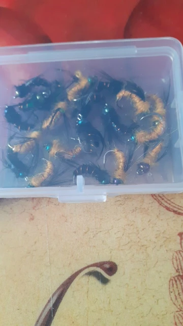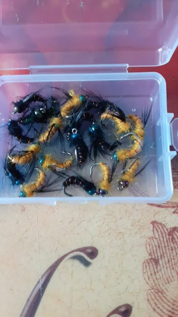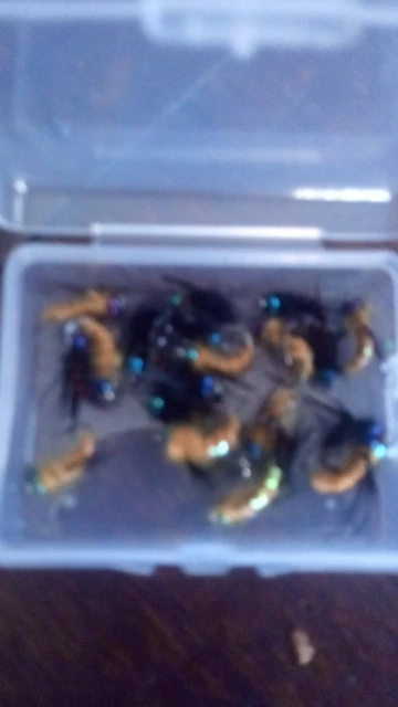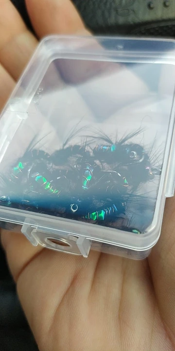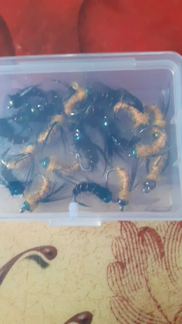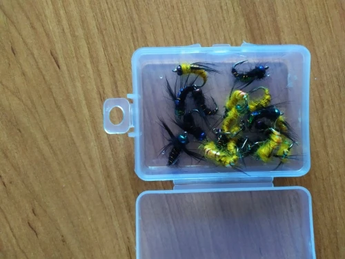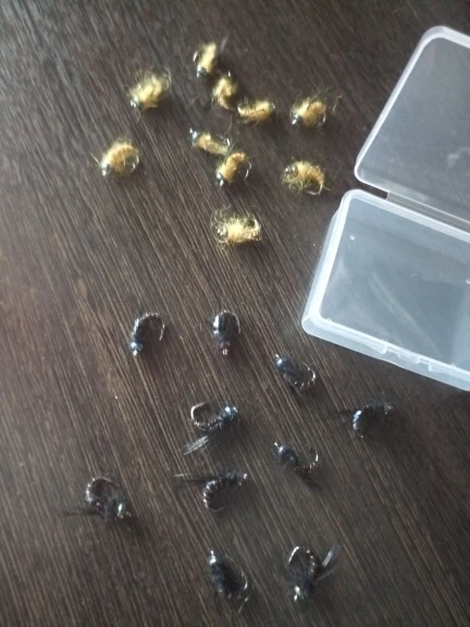 Мушки в коробочке в одной куче, Пришлось разъединять от крючков.