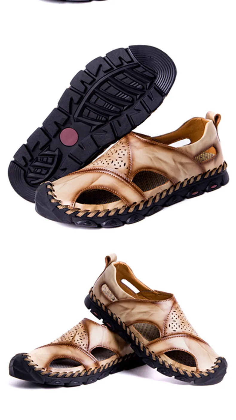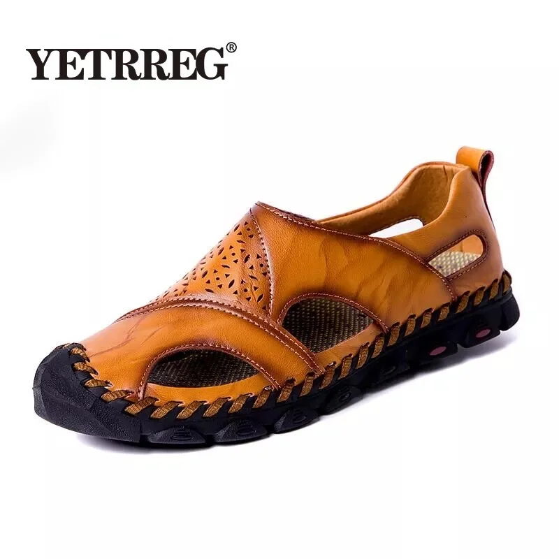 Сандалии мужские из натуральной кожи, дышащие, на плоской подошве, большого размера, пляжная обувь, для лета, 2019