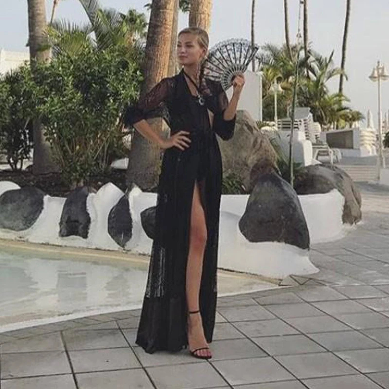 Женский сексуальный длинный шелковый халат-кимоно, банный халат, кружевное нижнее белье прозрачная ночнушка