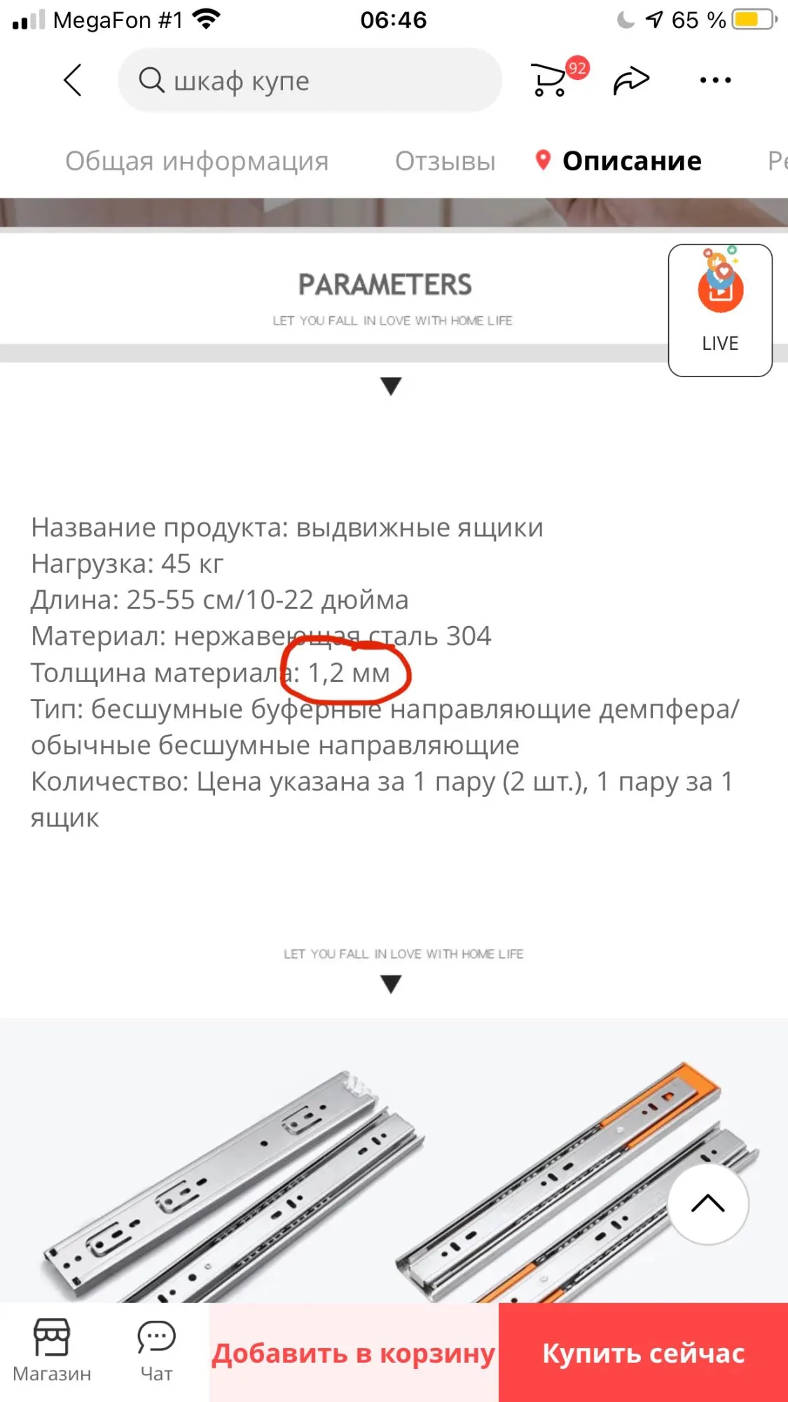 Материал нержавейка,еле дотягивает до одного миллиметра толщиной,чуть толще консервной банки.Для кухни не годиться,разве что для пустых ящиков.А так то механизм работает нормально,при закрывании срабатывает и дозакрывает.Покупкой не доволен,за такие деньги считаю что это розводняк на бабло.