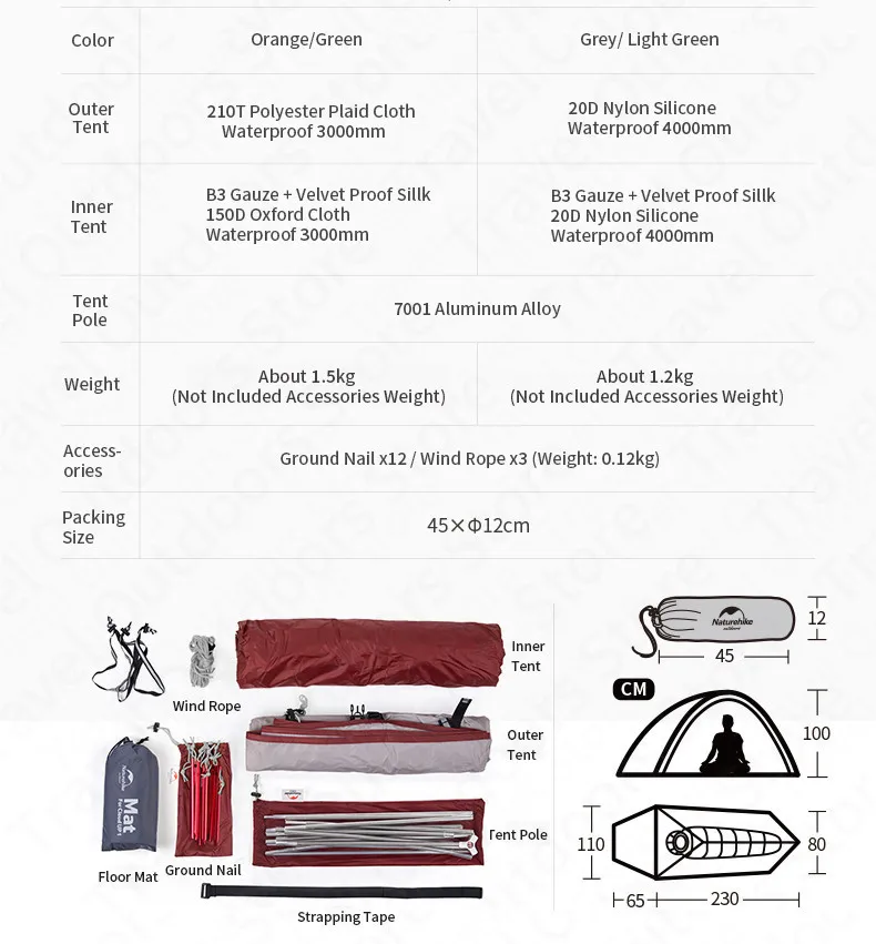 Внешняя палатка: 20D нейлон с силиконовым покрытием