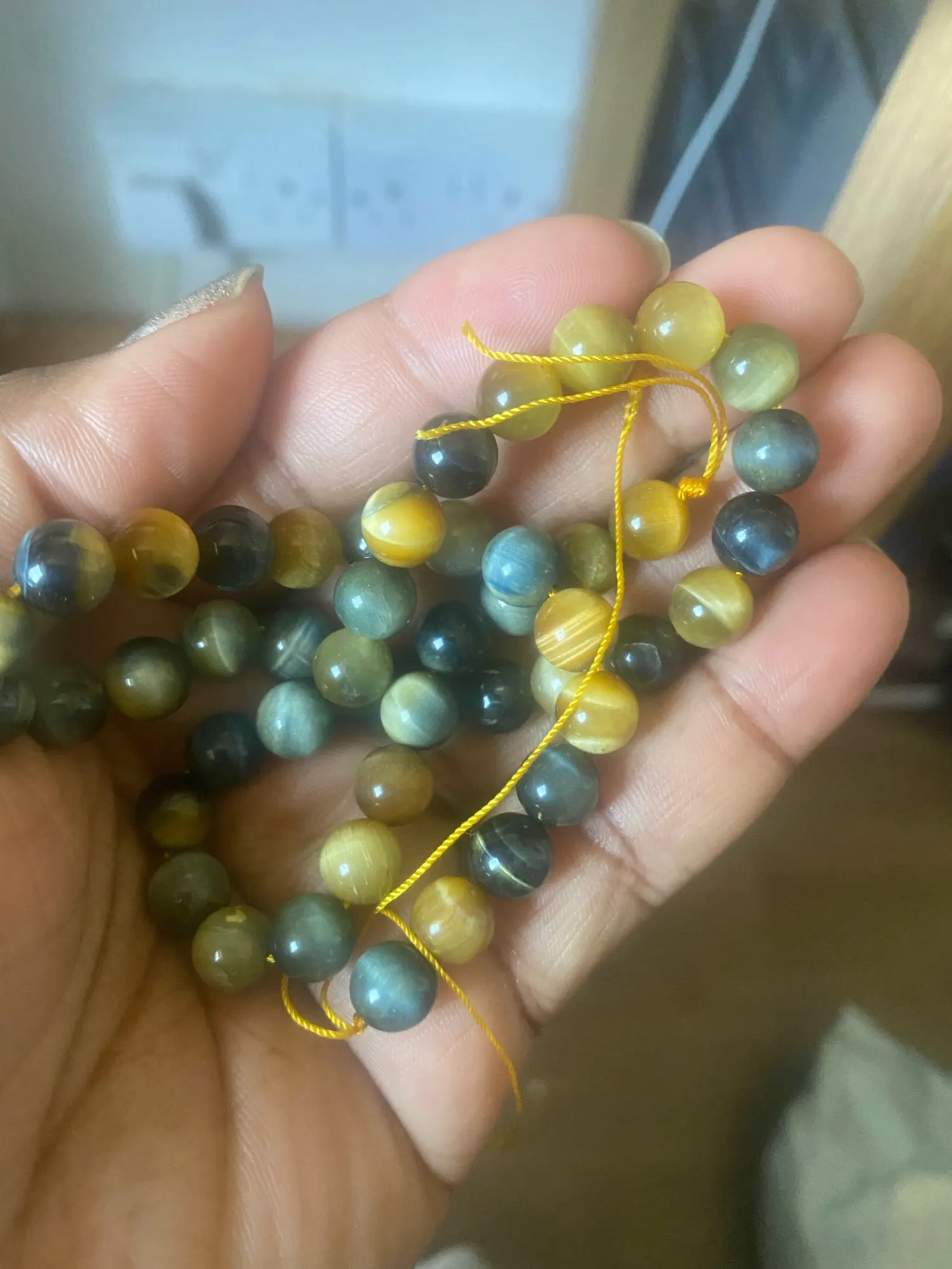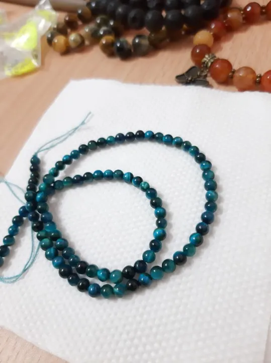 accurate 90 beads in string, mix of yellow and blue tiger eyes of 4mm, very pretty. seller also put the elastic cord & 2 accessories, deserves to be more than reccomended. shipping was fast too, about 1.5 months considering pandemic.