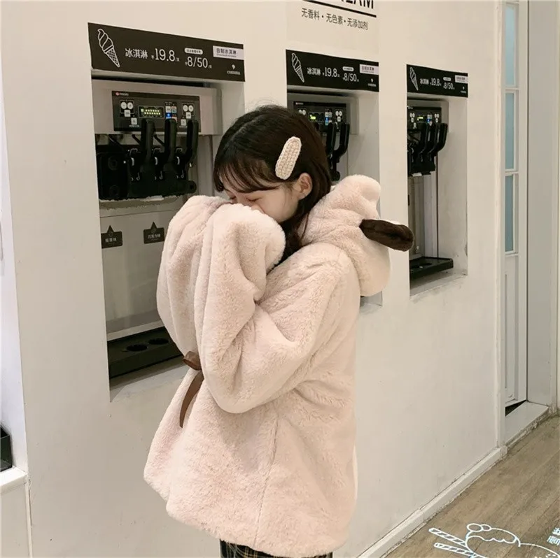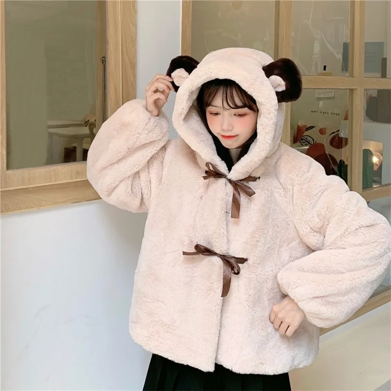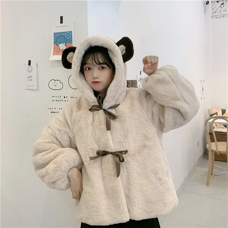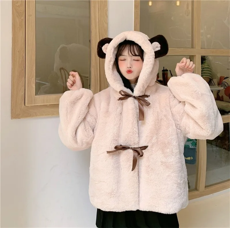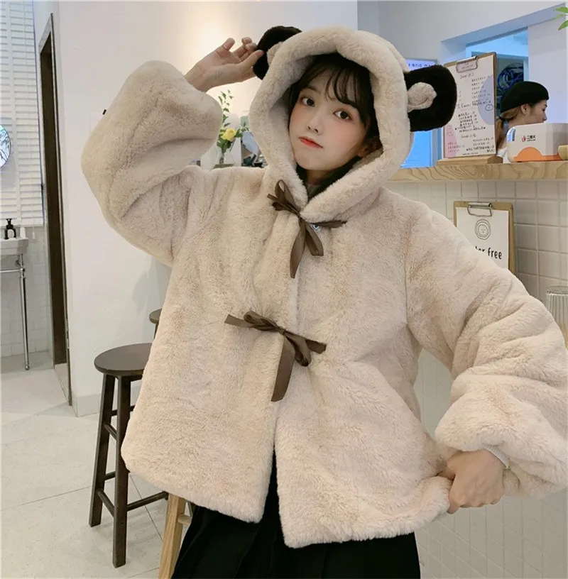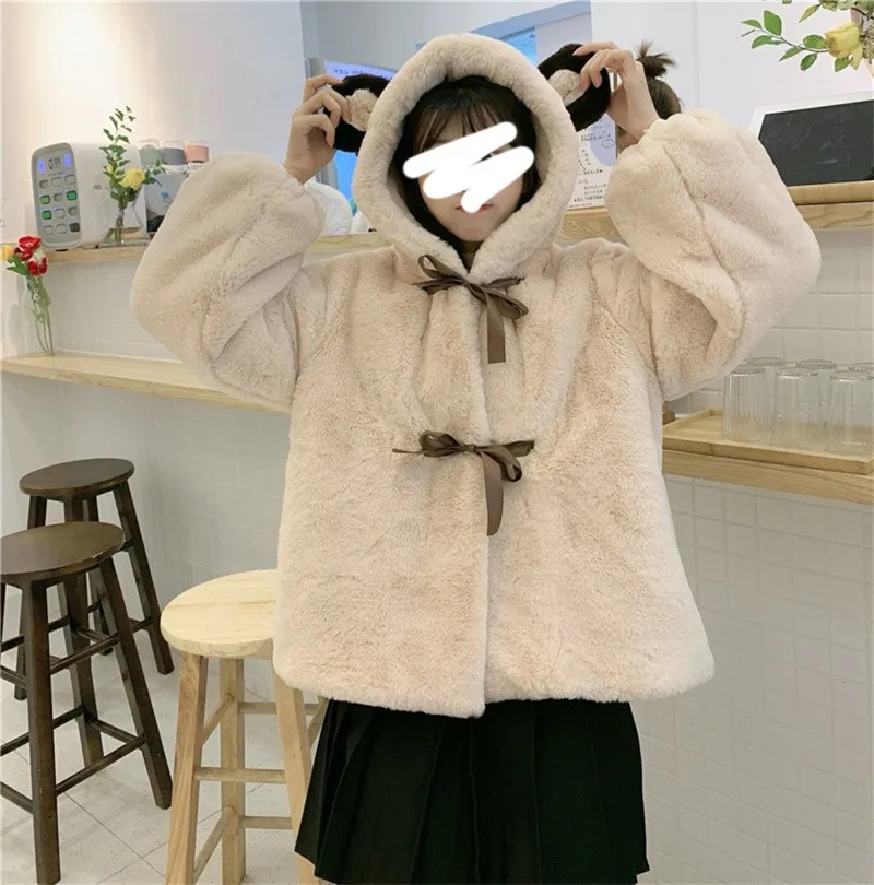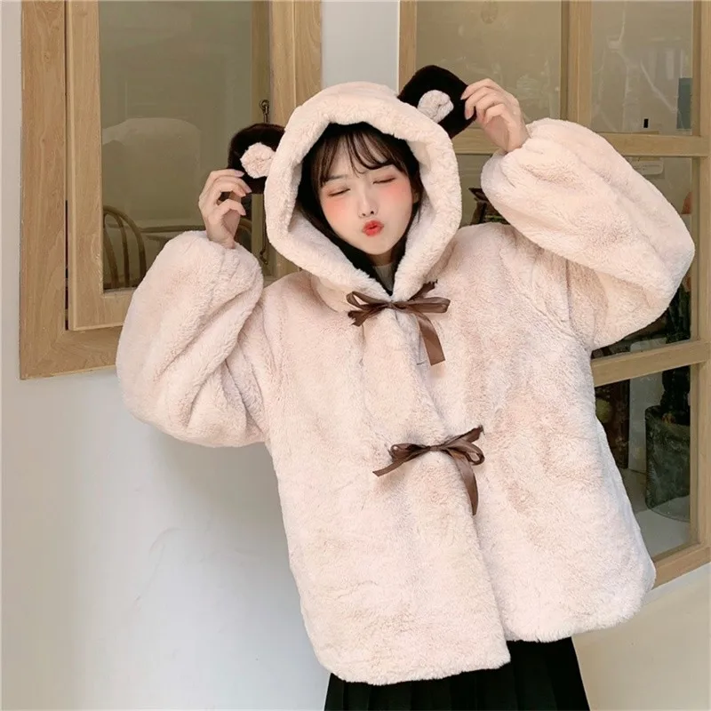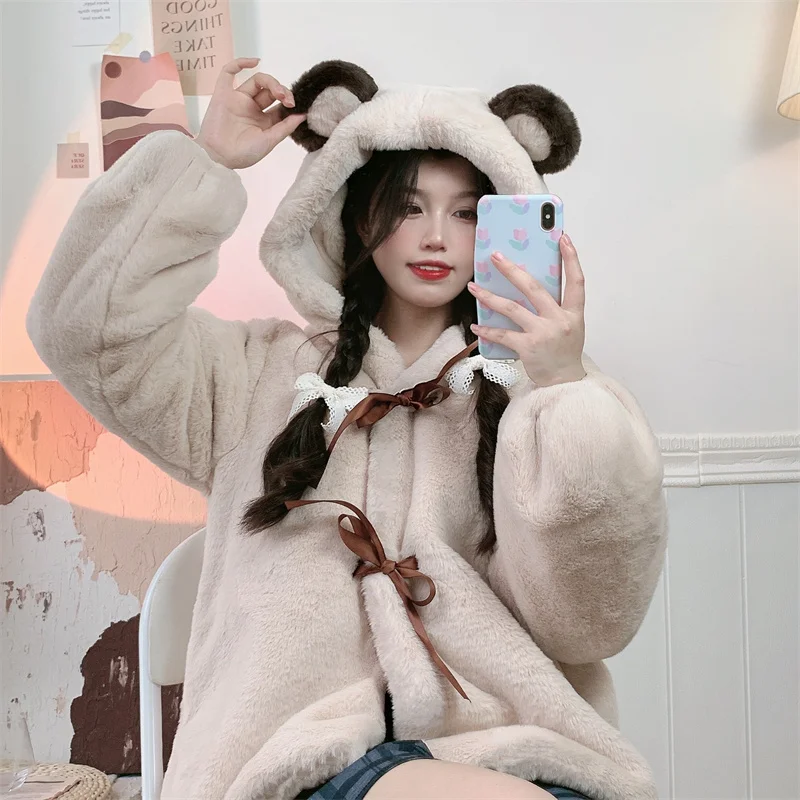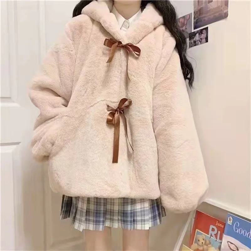 Японская зимняя женская верхняя одежда в стиле Лолита, мягкое плюшевое пальто с капюшоном для девочек, милая куртка в стиле каваи, утолщенная однотонная верхняя одежда в стиле Харадзюку