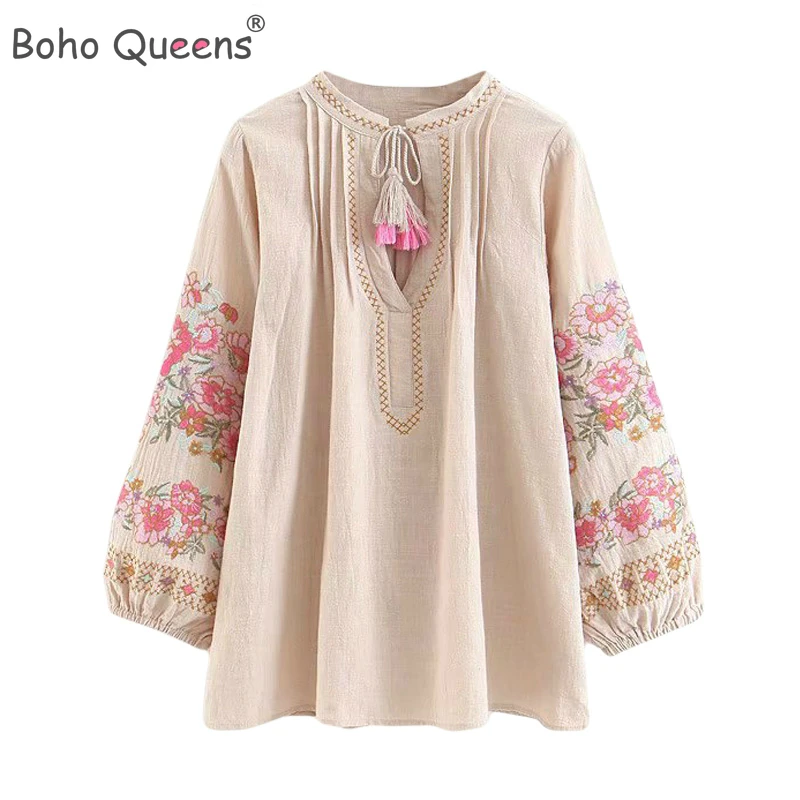 Женская рубашка с бахромой в стиле бохо, милая пляжная льняная хлопковая блузка с цветочной вышивкой, свободные богемные рубашки с расклешенными рукавами