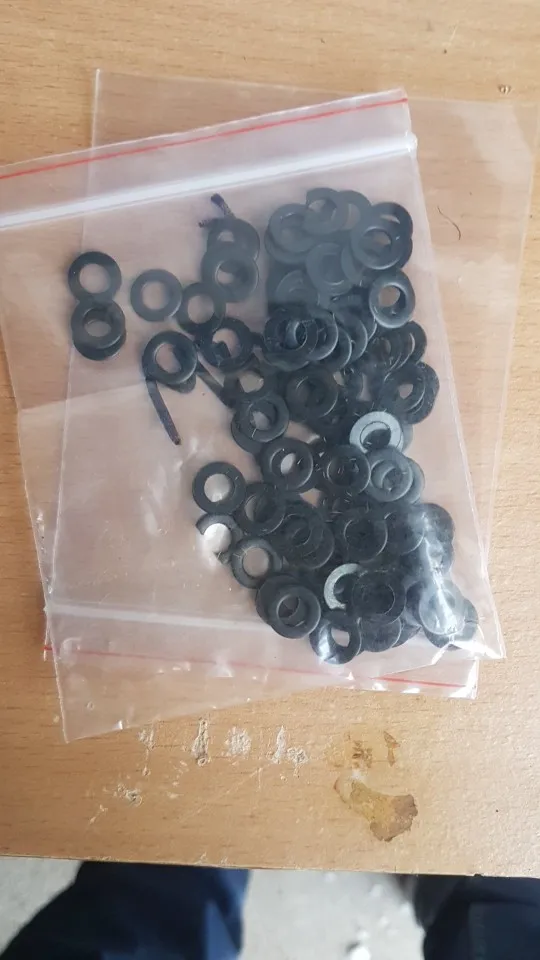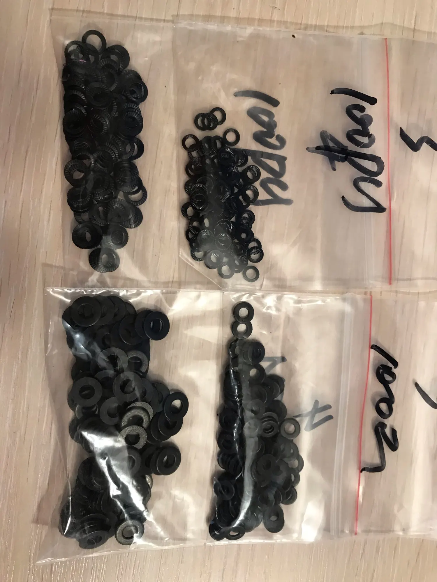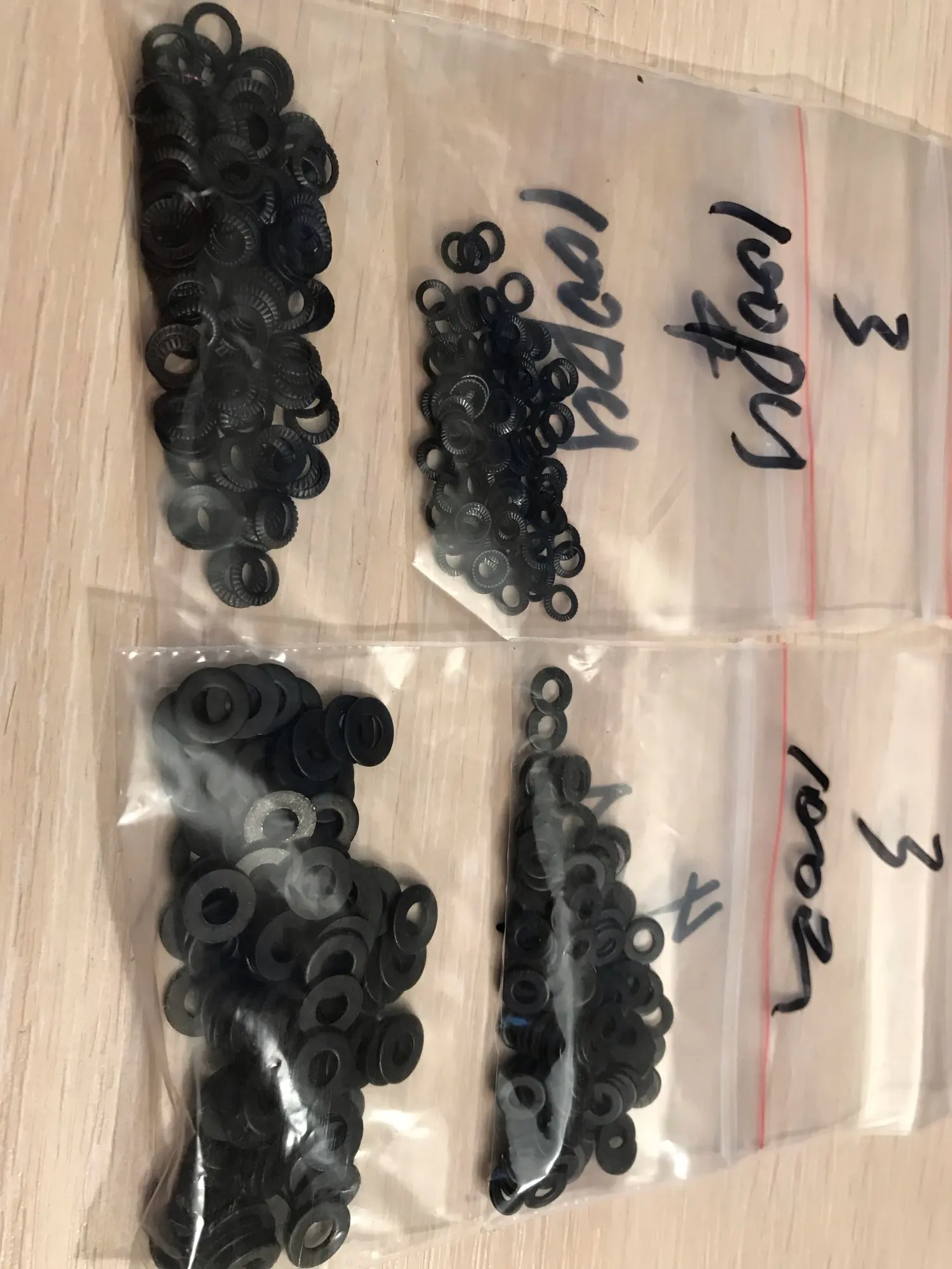 доставка в Москву за 18 дней. М3 размеры - ф 6,9 - 3,2 мм. толщина 0,7 мм - изза заусенцев . количество даже болше 100 шт. М4 - ф 8,9 - 4,2 мм. толщина около 1.0 мм - также изза заусенцев. количеств обольше 100. черное покрытие (скоре всего простая краска) держится слабо и легко царапается.