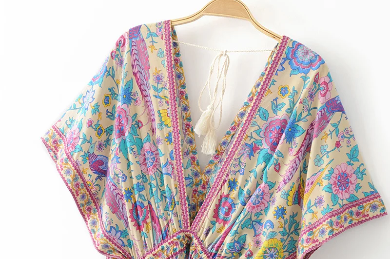 Женское богемное платье макси в стиле бохо, Пляжное платье с рукавом летучая мышь и цветочным принтом павлина, летнее платье с V-образным вырезом и бахромой