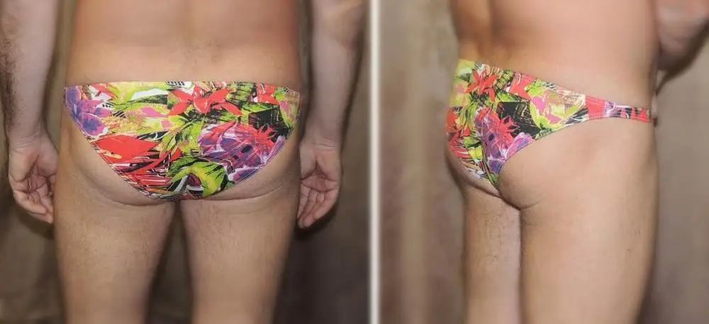 Трусики зачётные. На бёдра 100-102 размер 2XL наделись комфортно. Не маломерят. Под член всё помещается, если он у вас не очень большой и не стоИт))) Спереди выглядят миниатюрно, мне такой дизайн нравится, а с попы - как обычные брифы/ слипы. На фото показал. По мне - это не очень сексуально, хотелось бы чуть пооткрытее. Материал по ощущению дышит. Такие трусики для повседневной нОски (не зимой))) - вполне хороши. И да... Раз спереди миниатюрно, то растительность надо "прибрать" ))) Продавцу - респект!