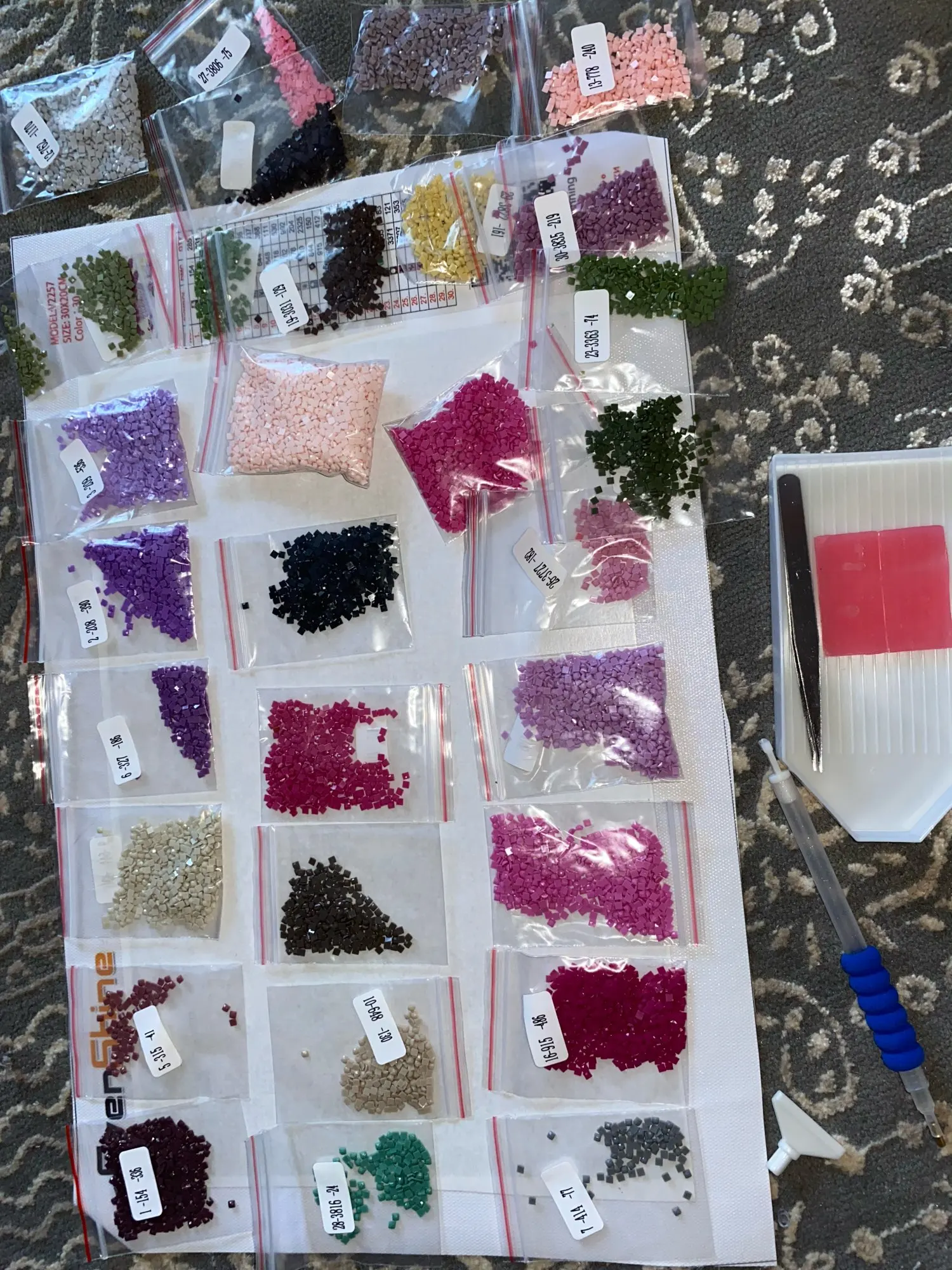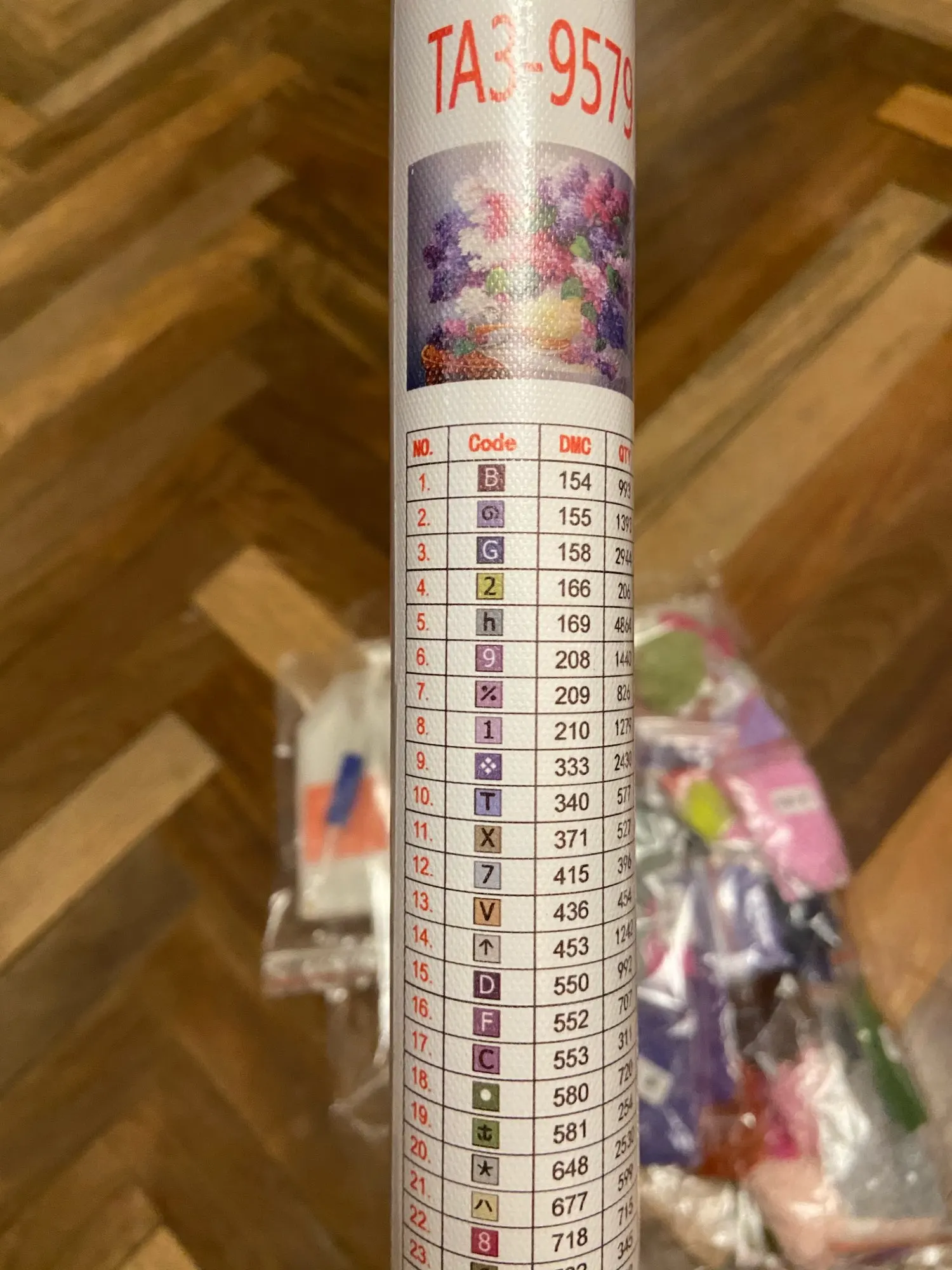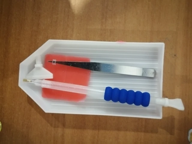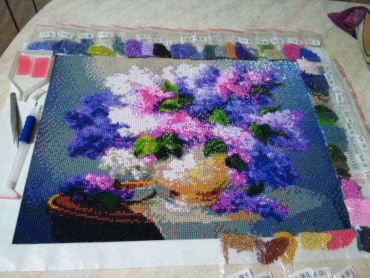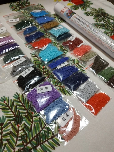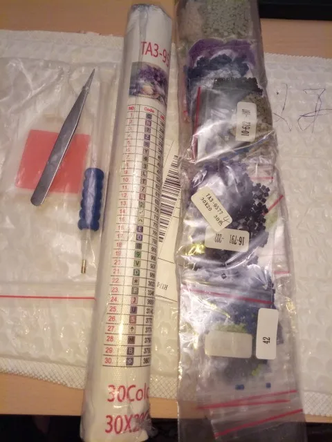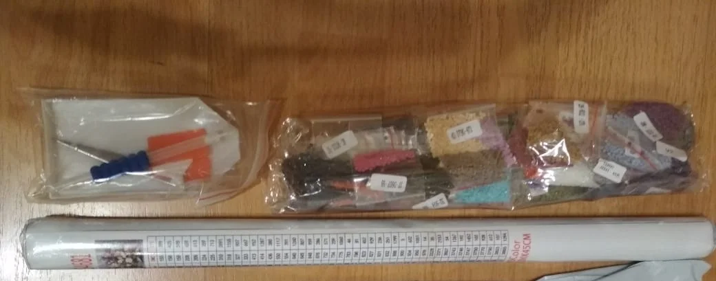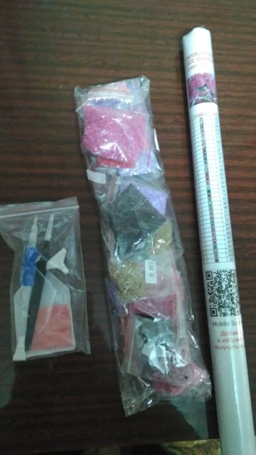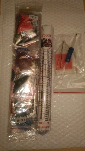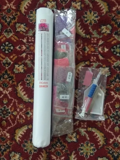 Заказ приехал за 2 недели до Санкт-Петербурга, отслеживался на всем пути. Комплектация полная, все на месте и на первый взгляд, качество страз хорошее. Понравилось, что упакованы в зип-пакеты. Полотно было намотано на валик, не помялось и выглядит идеальным по качеству. Пропечатка схемы на уровне, но мне кажется, что будут ломаться глаза из-за похожих символов, посмотрю как будет в работе. Не понравился набор инструментов. Стилус классический с насадками на 4 и 10 страз. А вот пинцет слишком хилый, лоток вообще кривой. Благо у меня есть другие наборы инструментов и для меня это не проблема. Дополню отзыв, когда выложу часть картины.