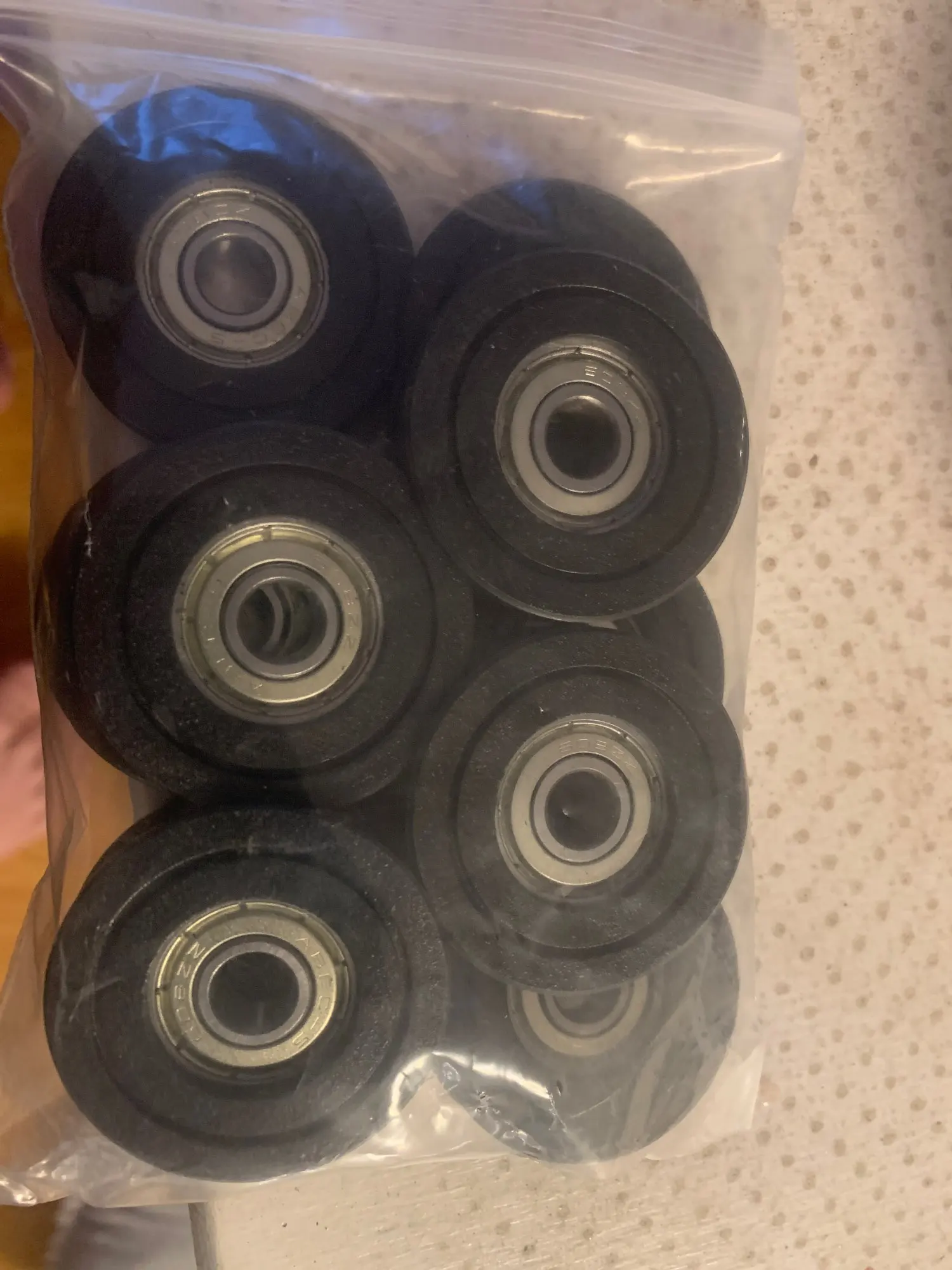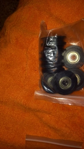 Хорошие ролики, только пластик хрупковат, уронил один ролик на плитку и край обломился, а так, на истирание вроде прочные, катаются с грузом около 20кг по стальному тросу, полёт нормальный)