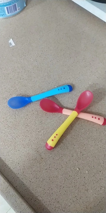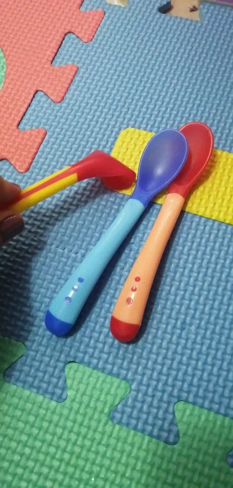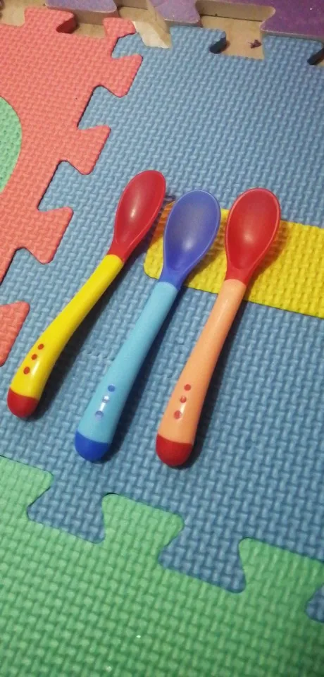 Эти маленькие ложки идеальны! Они меняют цвет, если еда слишком горячая, что позволяет нам ждать, не ощущая еду ребенка