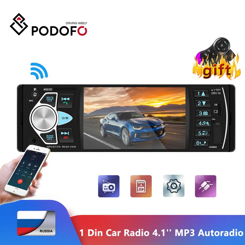 Автомагнитола Podofo, 1 Din, 4,1 дюйма, цифровой дисплей, Bluetooth, FM, MP3, мультимедийный проигрыватель, 1 Din, аудио, радио, USB, FM, резервный монитор