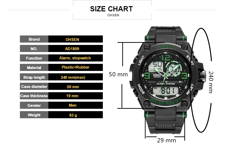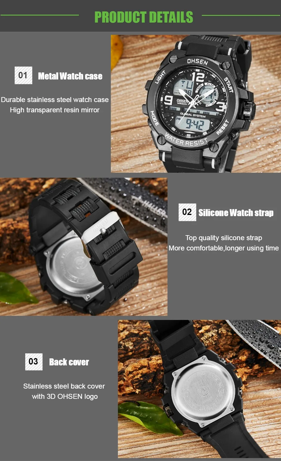 Прочный водонепроницаемый металлический корпус часов Защитная пленка высокой прозрачности зеркало из смолы Хорошее качество резиновый ремешок, более удобный Задняя крышка из нержавеющей стали с 3D логотипом OHSEN
