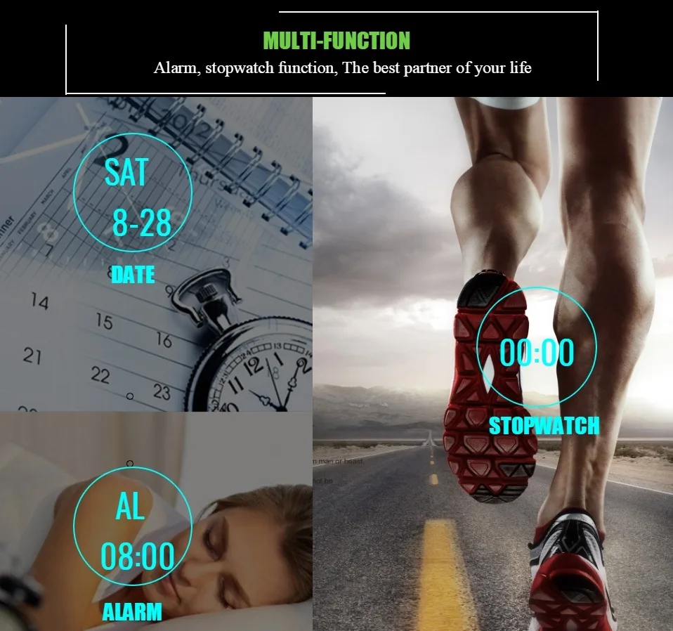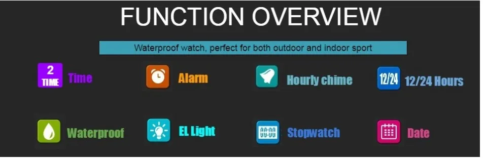 С двумя часовыми поясами Дисплей Цифровой: часы, минуты, секунды, pm, месяц, дата, день 12/24 формата отображения времени Цифровой светодиодный дисплей, нажмите кнопку «свет», чтобы четко увидеть время в темноте Функция будильника и ежечасного звонка Специальный дизайн с хронографом (секундомером) с шагом 0,01 секунд Водонепроницаемость до 50 м (не нажимайте кнопку в воде) Секундомер, запись времени, ваш лучший спортивный партнер Ударопрочность, подходит как для спорта на открытом воздухе, так и для занятий спортом в помещении