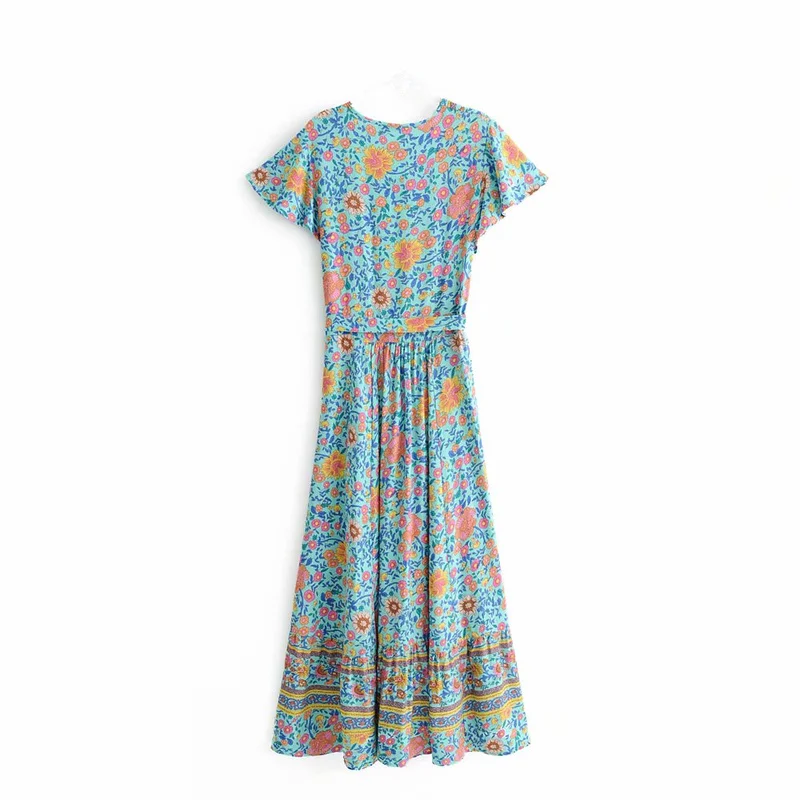 Винтажное шикарное женское Пляжное Платье макси с цветочным принтом и рукавом летучая мышь, богемное женское платье с перекрестным V-образным вырезом и поясом, хлопковые платья бохо из вискозы