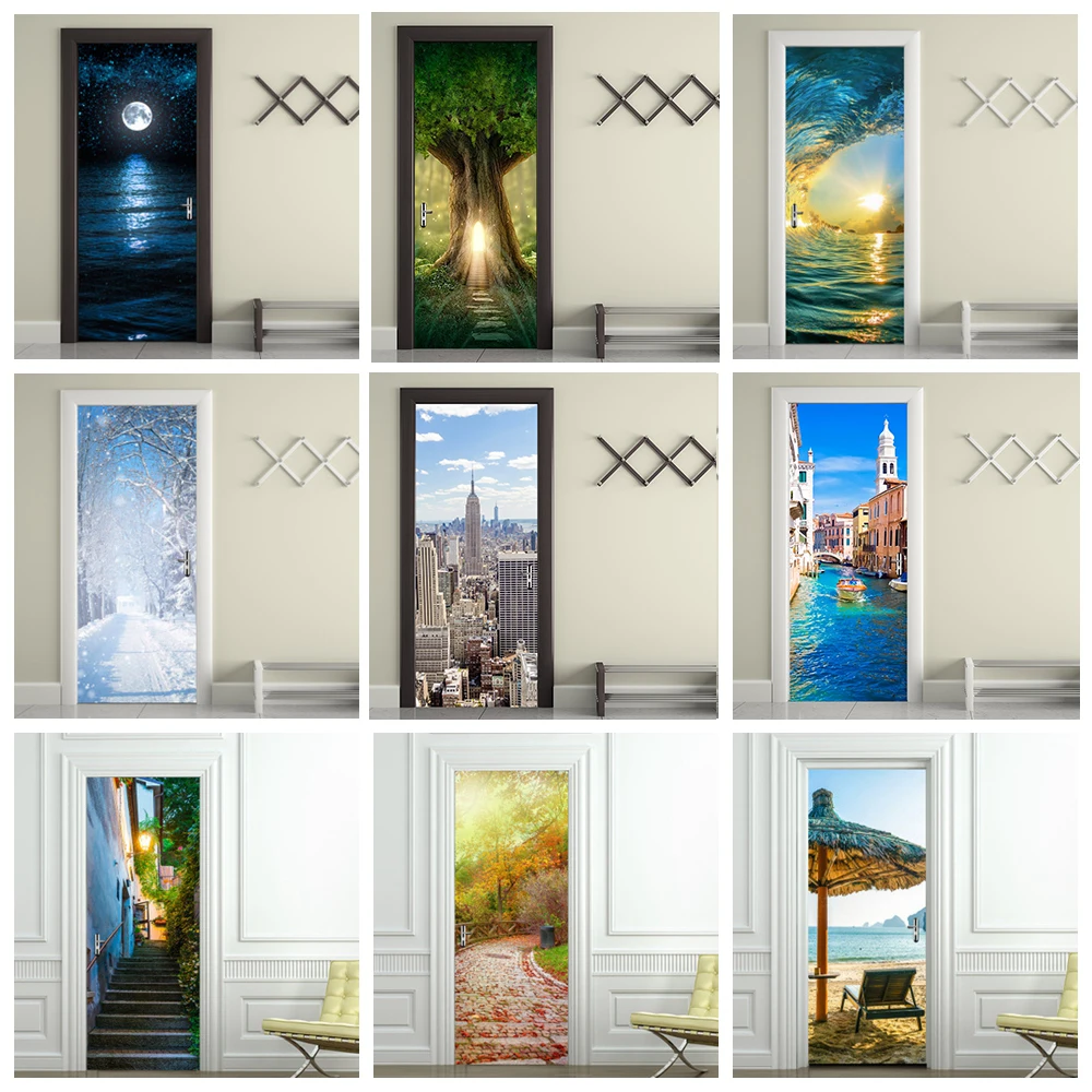 Домашний декор, 3d наклейка-колесо, наклейка на дверь, пейзаж, художественные обои на дверь, водонепроницаемый постер для украшения стен и дверей