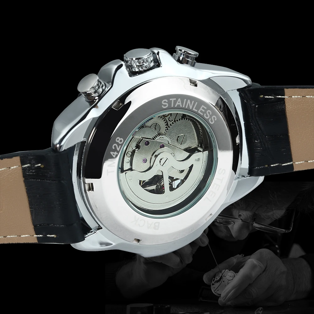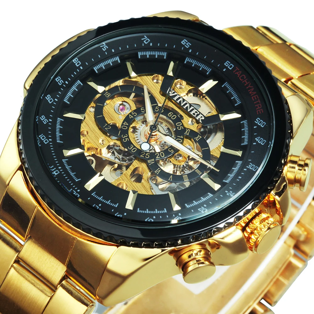 Часы наручные WINNER Мужские механические, брендовые Роскошные Дизайнерские Автоматические классические золотистые стальные часы-скелетоны в стиле милитари