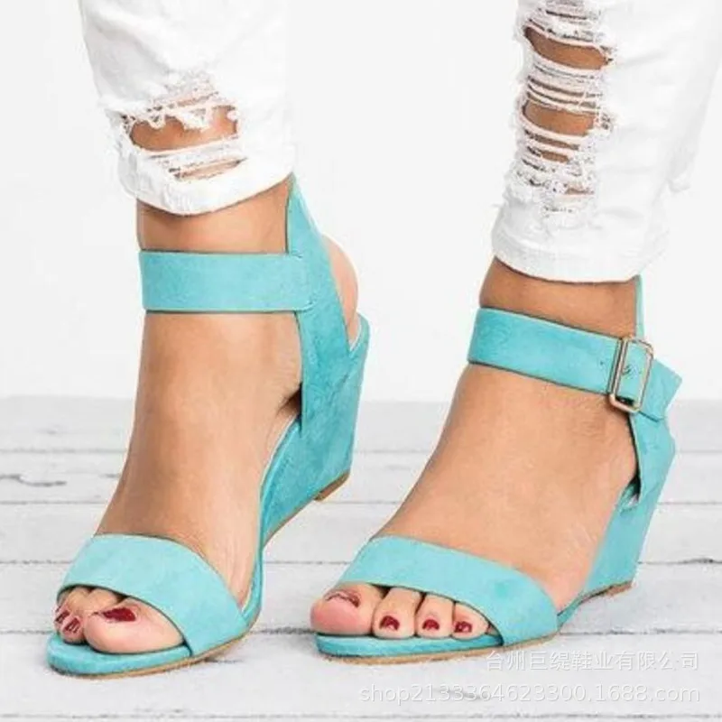 Женские босоножки на танкетке, повседневные Босоножки на платформе и высоком каблуке, Простые сандалии с ремешком и пряжкой, большие размеры 34-43, лето 2019