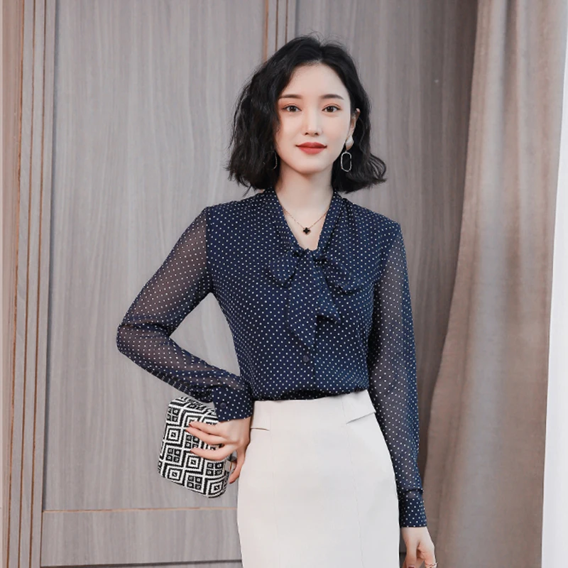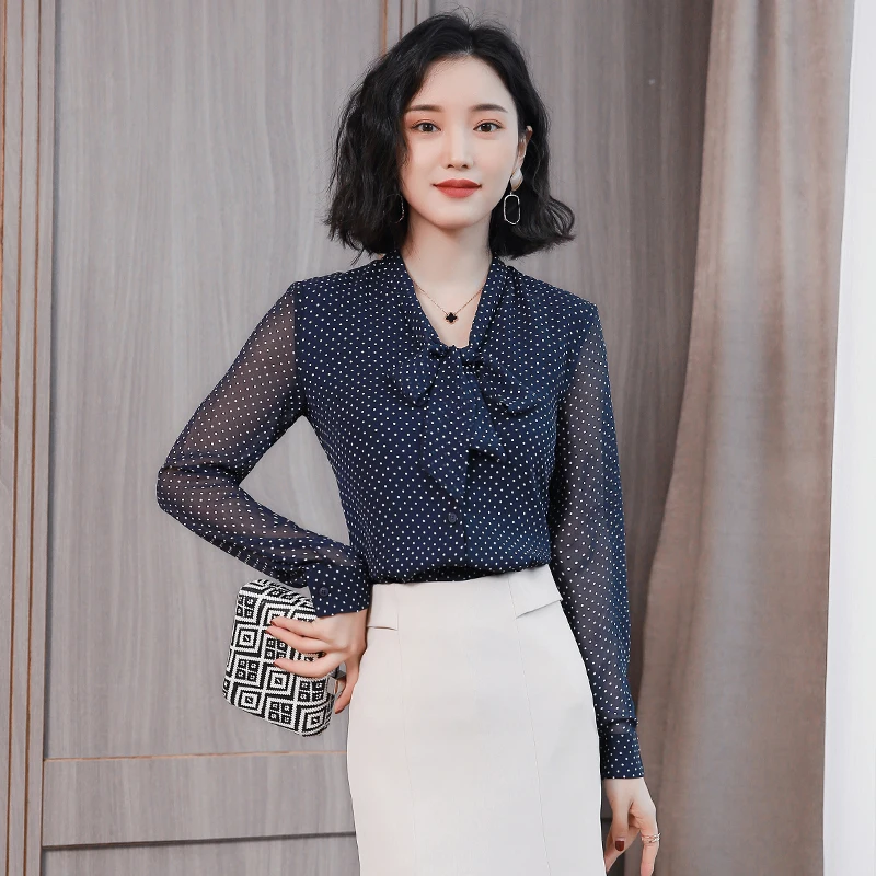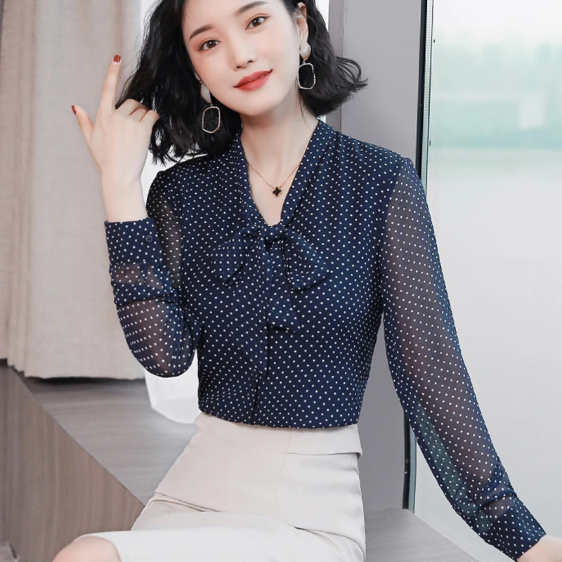 женская Модная блузка с воротником-бабочкой, блузка, женские топы, точечный принт-шифон, блузка, рубашка с длинным рукавом, рубашка женская женские топы 1864 50