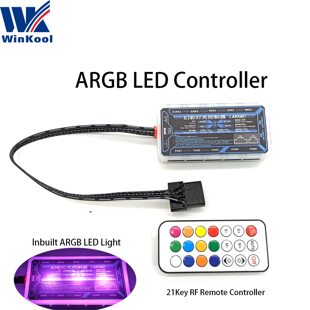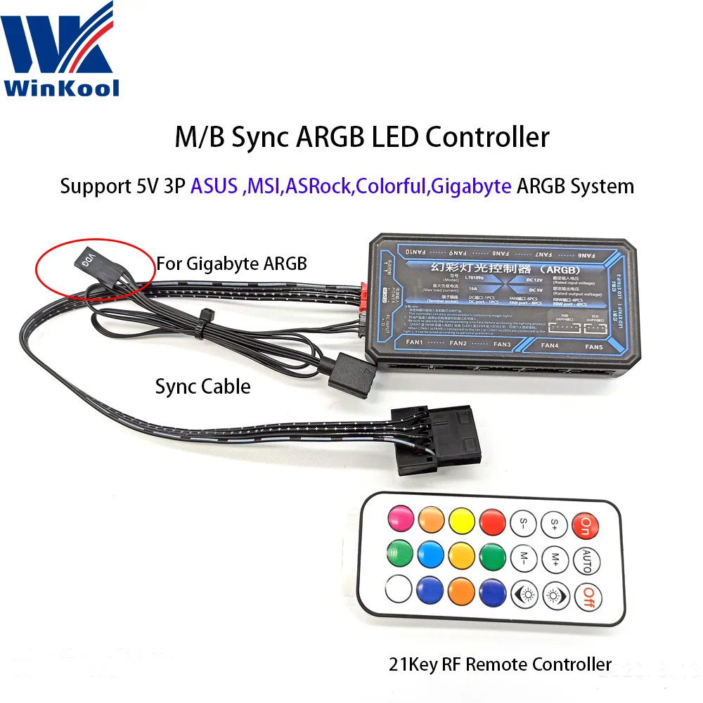 WinKool 6Pin ARGB Fan RF пульт дистанционного управления, 10 вентиляторов и 2 светодиодных порта, синхронизация материнской платы, светодиодный контроллер