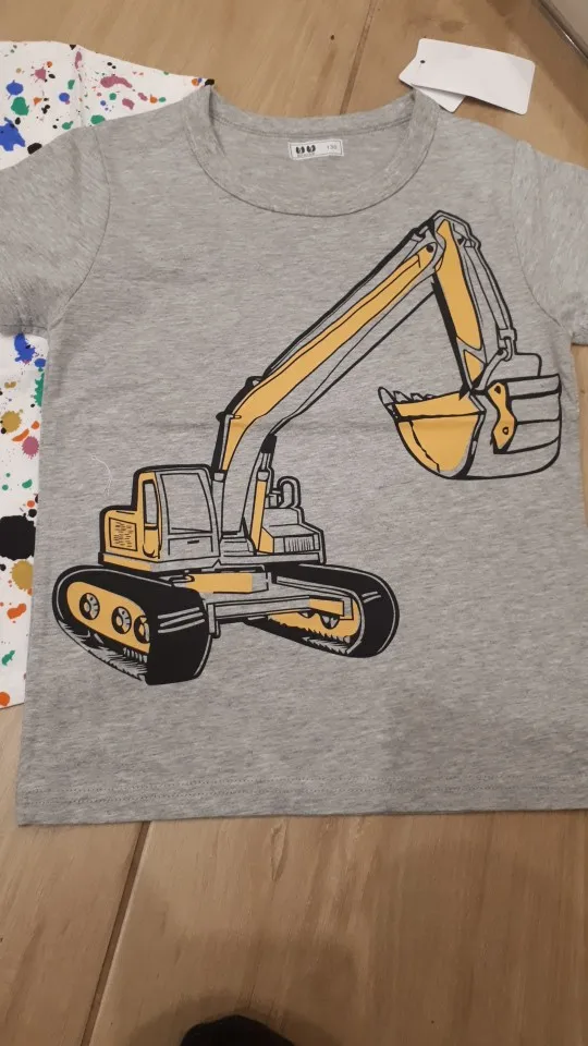 футболка хб с хорошим принтом, видно что метод шелкографии, а значит рисунок не потрескается и не потускнеет от пары стирок. брали для ребенка как большого любителя экскаватора, ему понравилось и это главное