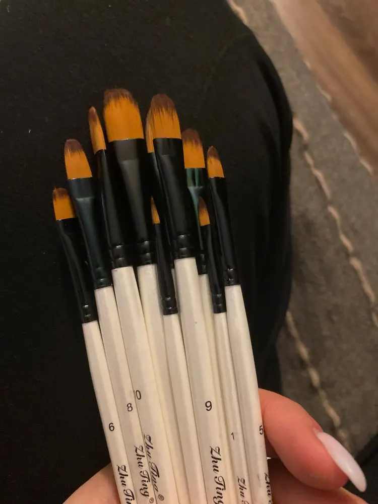 4 звезды только за девятку. кисть номер 9 ужасно линяла, даже тогда, когда я не начала работать с красками. это меня расстроило. но, все кисти безумно качественные и очень удобные. клей, в котором находились кисти, очень быстро растворился в воде. заказ шёл полмесяца, спасибо.