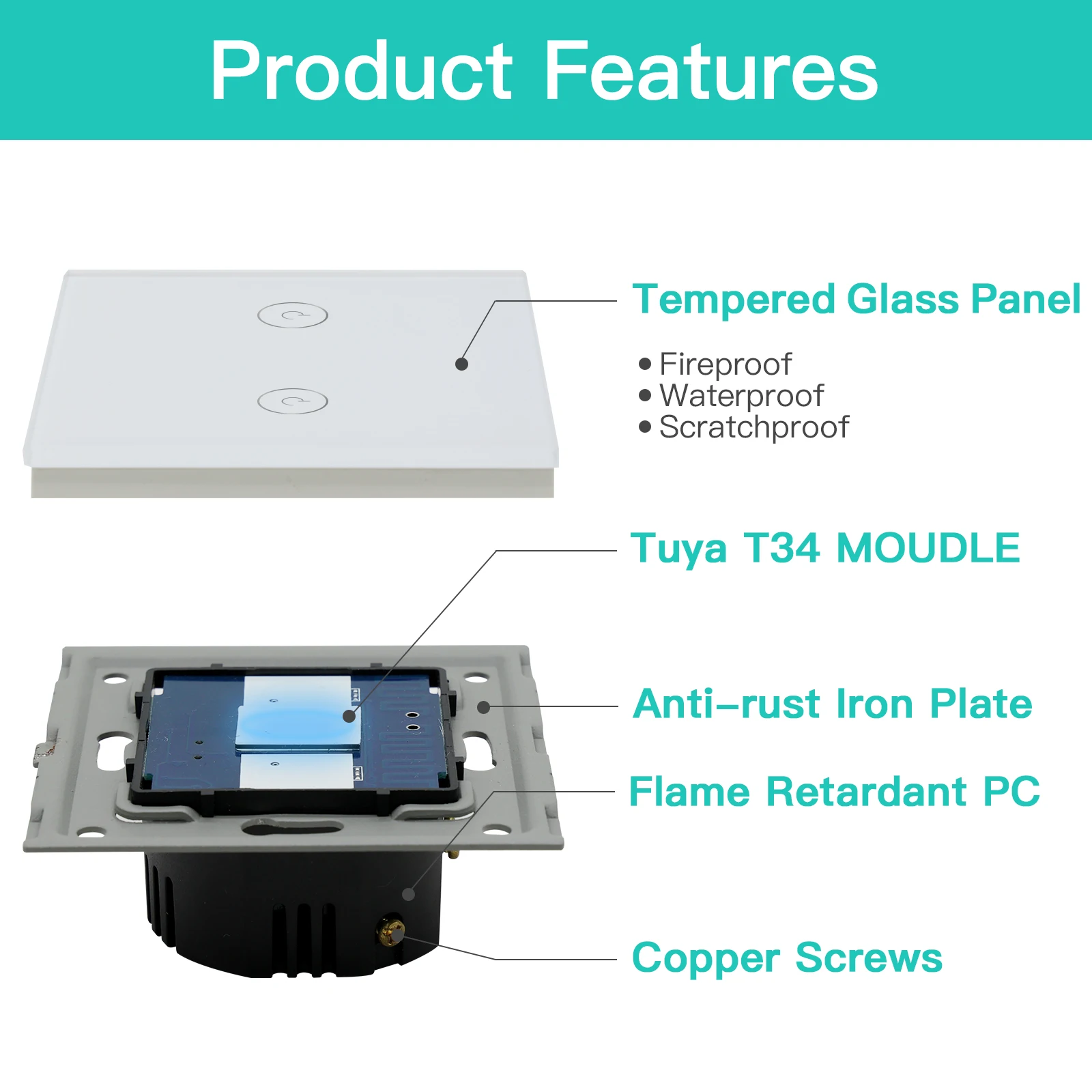 Сенсорный выключатель Bseed Mvava с поддержкой Wi-Fi, 2 клавиши, 134-канальный Умный Выключатель со светодиодными кнопками, стеклянная панель, умный выключатель, работает с Tuya Google Home